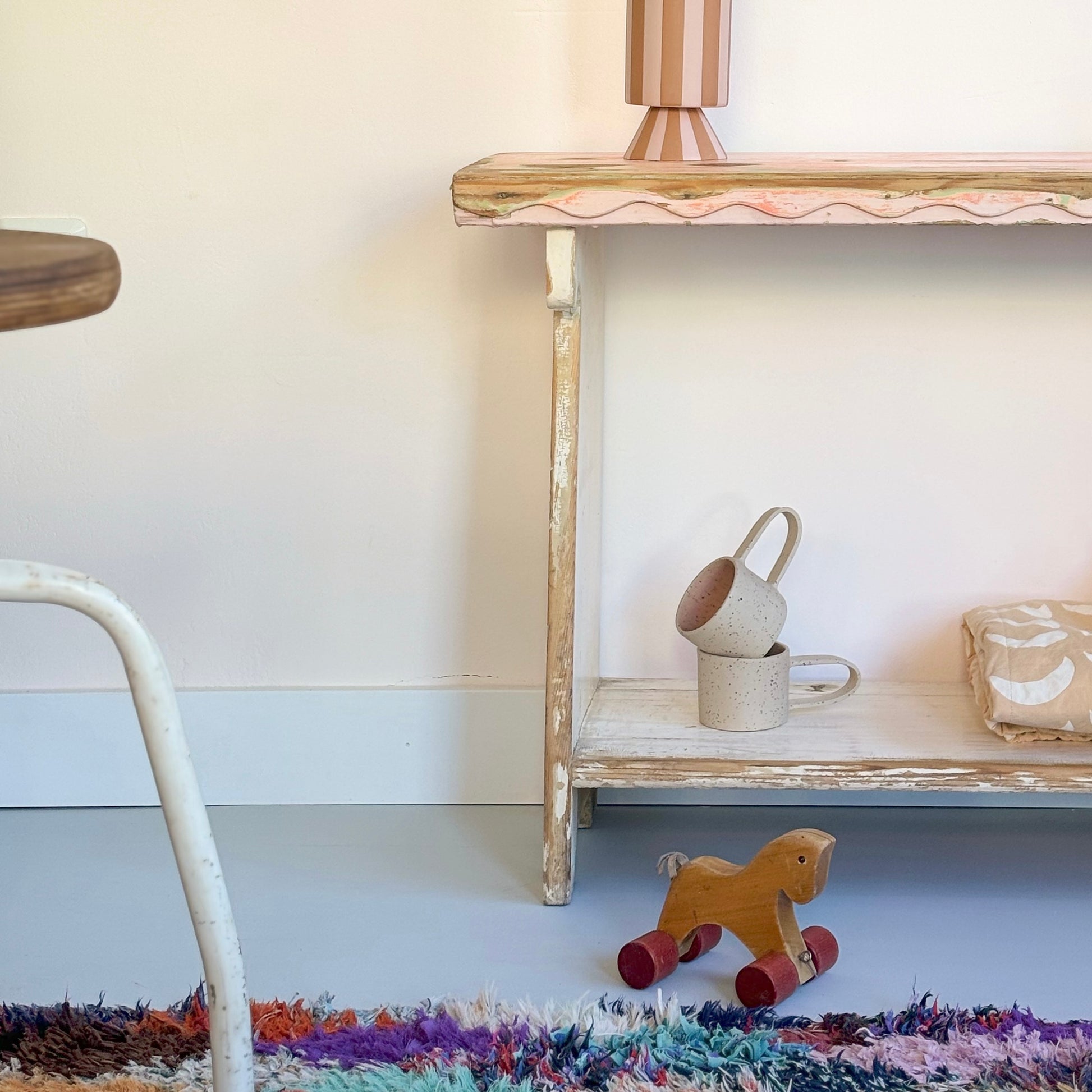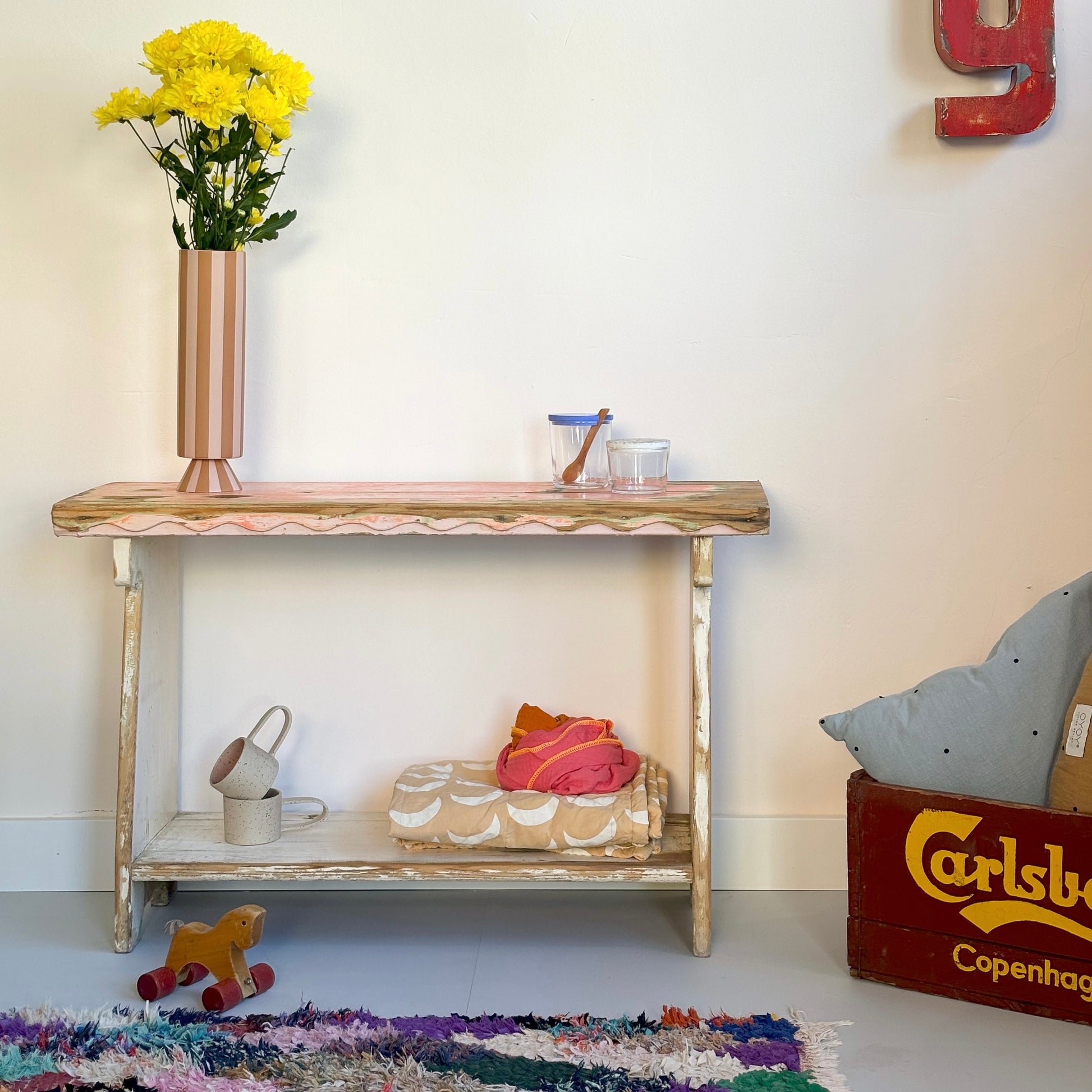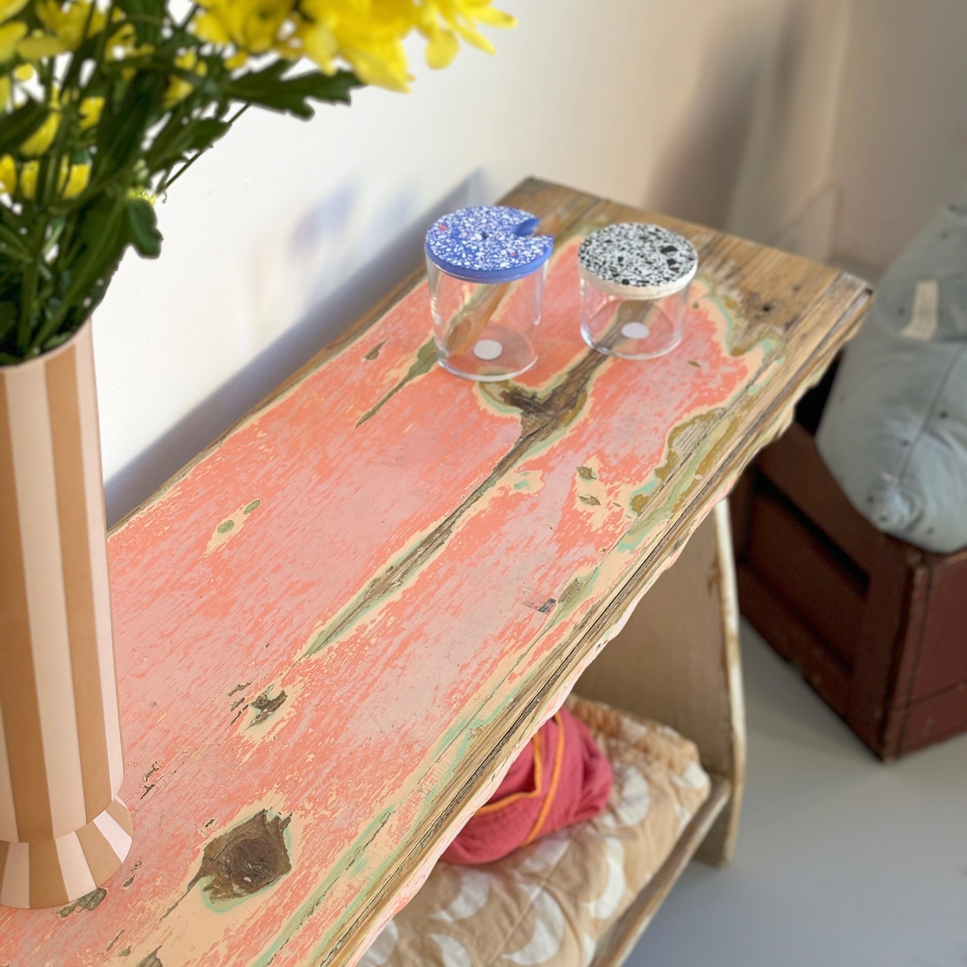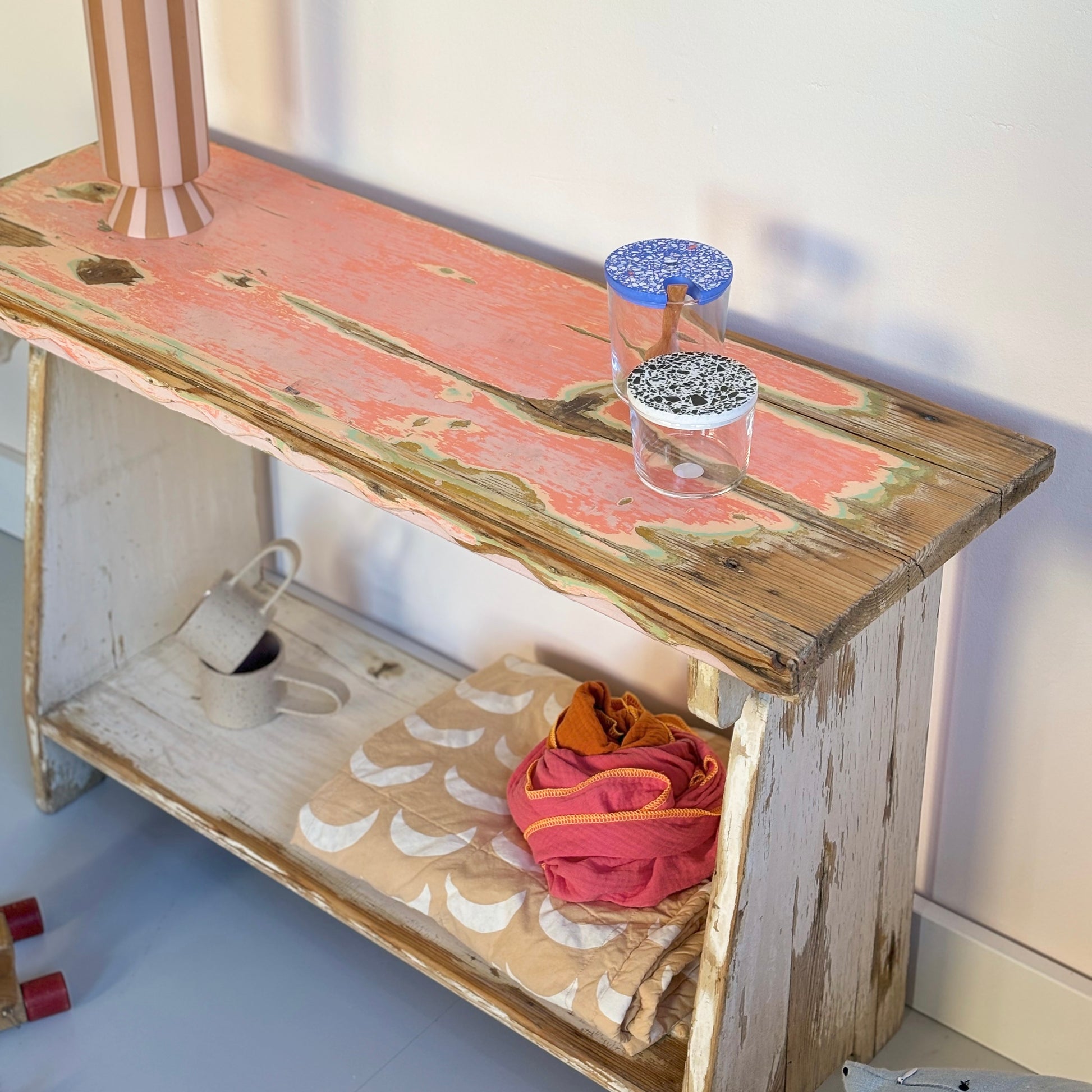 Sie heißt Amelie und ist gut 100 jahre alt. So mancher hat seinen individuellen Anstrich an Ihr gelassen und so hat sie eine Schöne Patina aus Holz. Weiß, Rosa und Grün. Wir haben fast nichts verändert. nur die Abplatzer etwas beigeschliffen und alles etwas versiegelt.