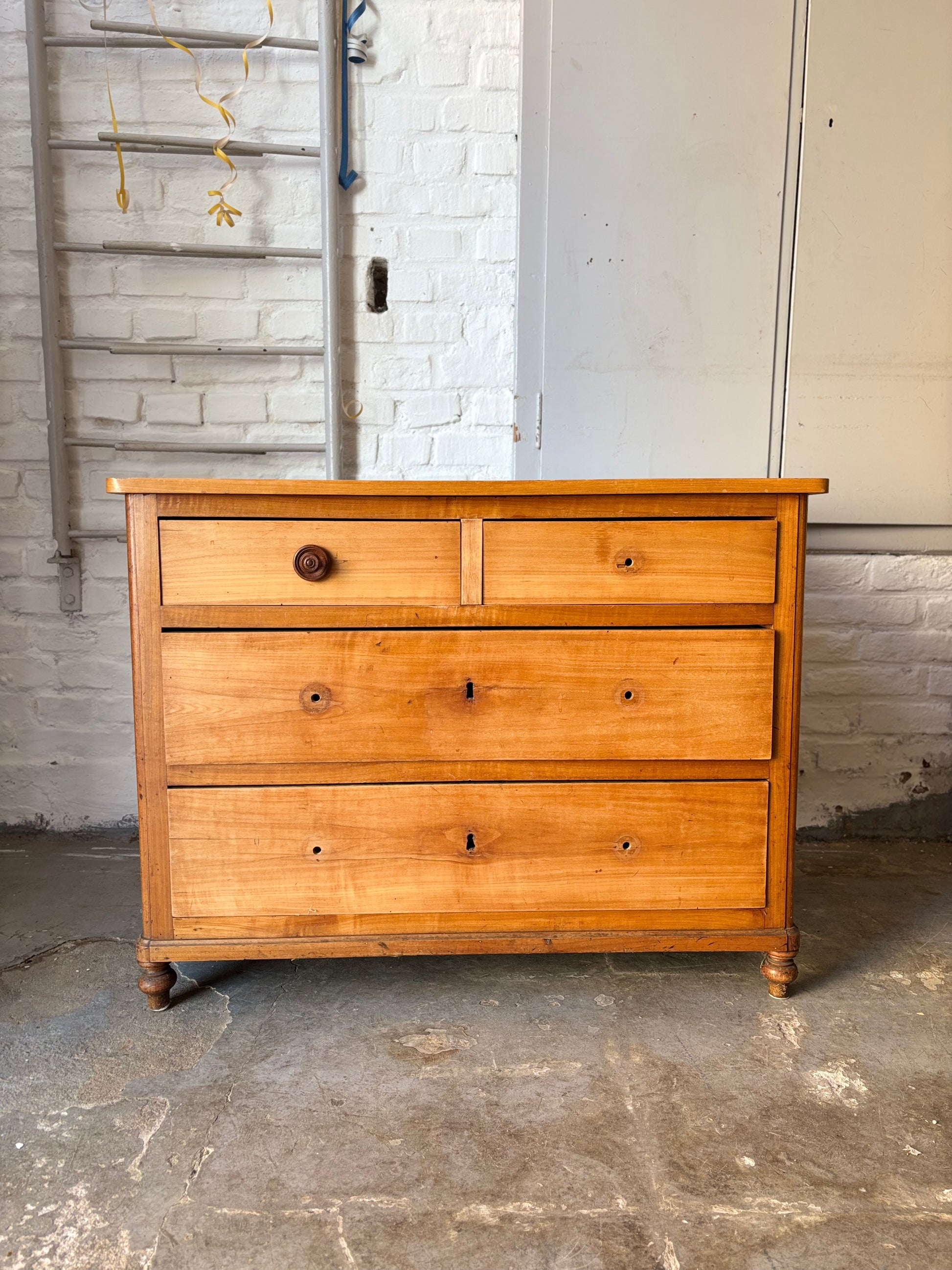 Sie verfügt über insgesamt 4 Schubladen und wir von uns aufgearbeitet. Nach Kundenwunsch wird sie in der Farbe Kakelugn Nr. 317 von Farrow and Ball (Finish: Eggshell) lackiert und mit neuen Porzellanknöpfen in Creme und Rosettenform versehen.