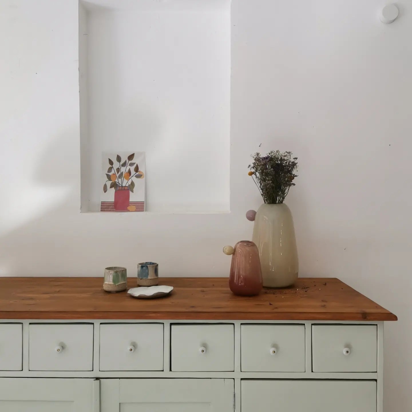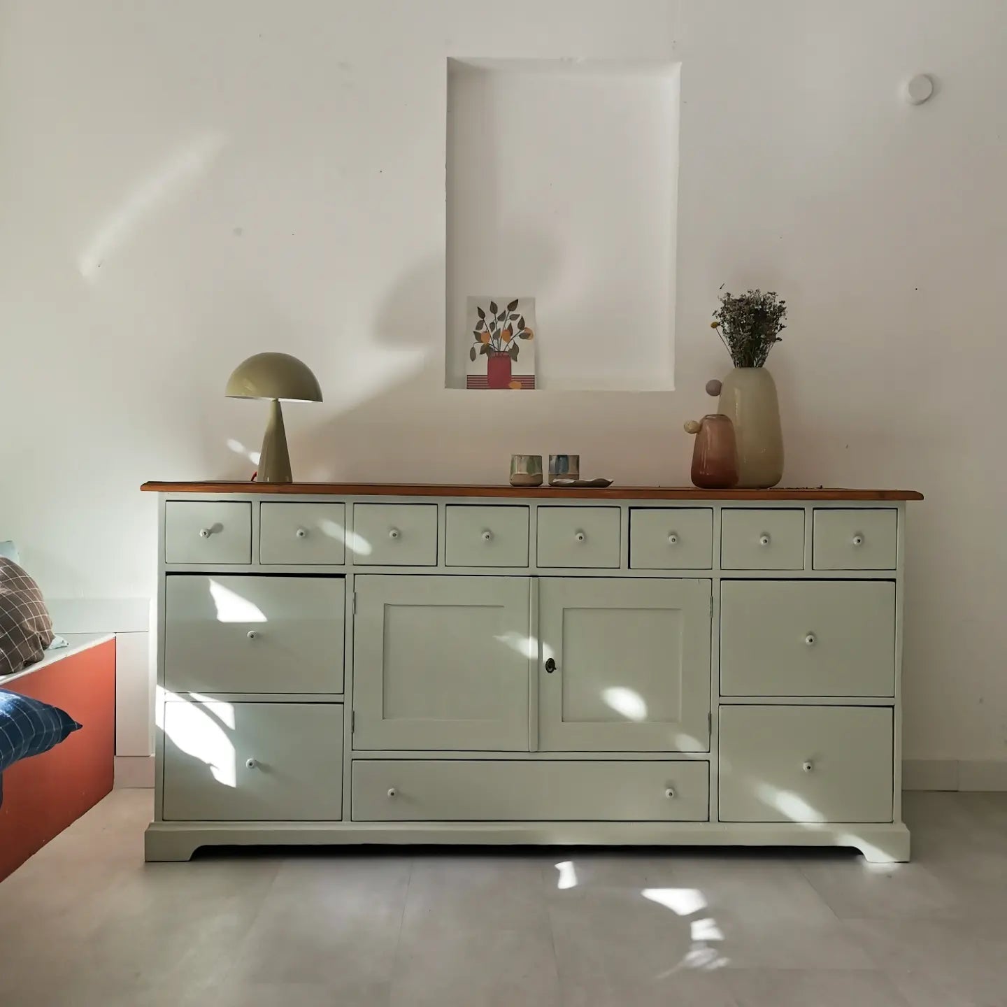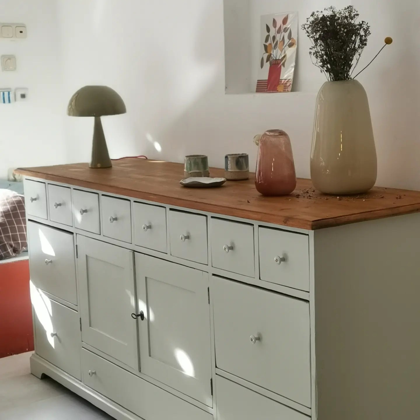 Sonnige Grüße aus dem Lädchen mit diesem tollen alten Apothekersideboard. Richtig viel Arbeit und Liebe ist in dieses Schätzchen geflossen. Alle Schubladen wurden Innen und Aussen geschliffen, die Platte wurde ebenfalls geschliffen und dann gewchat. Der Schrankteil hat ein schönes helles grüngrau bekommen und alles wurde mit neuen Porzellanknöpfen versehen. Hier lässt sich richtig viel Verstauen!