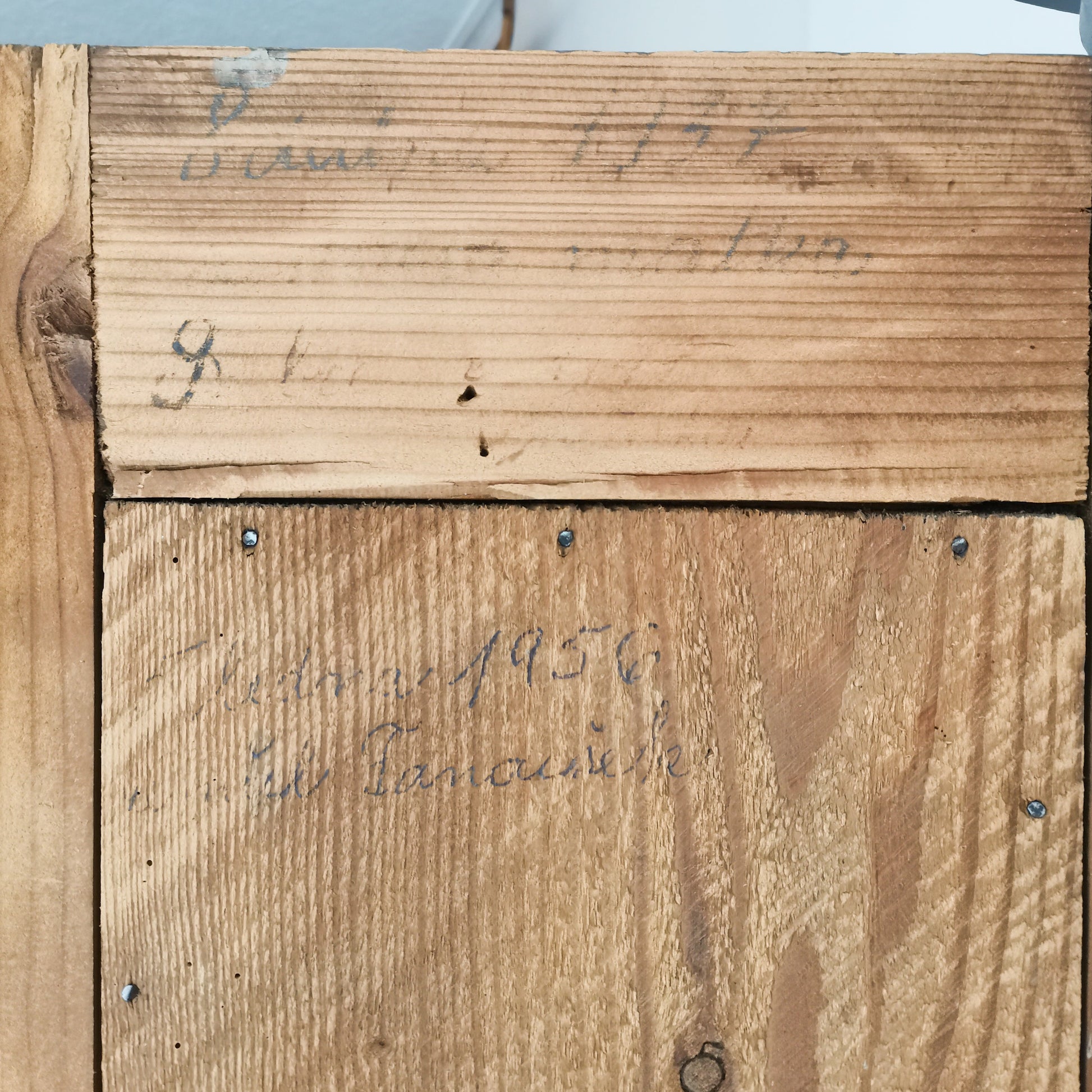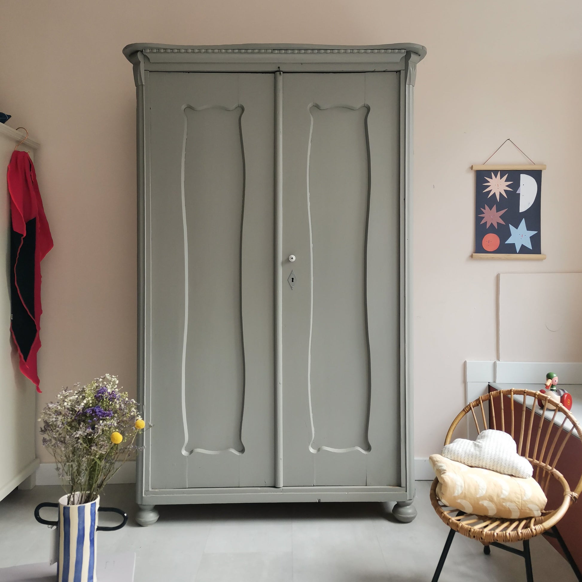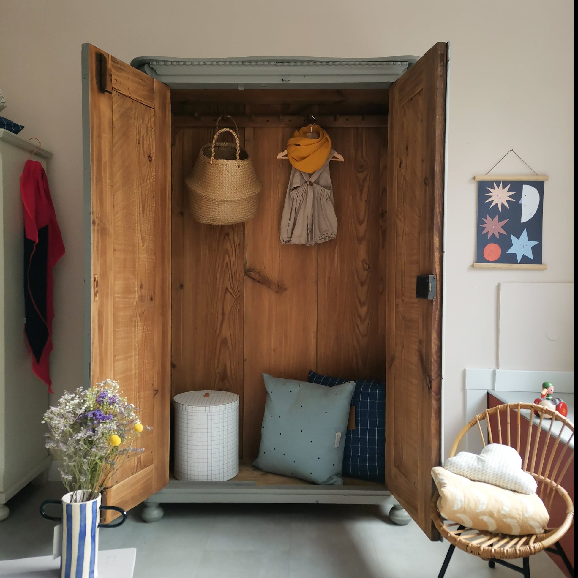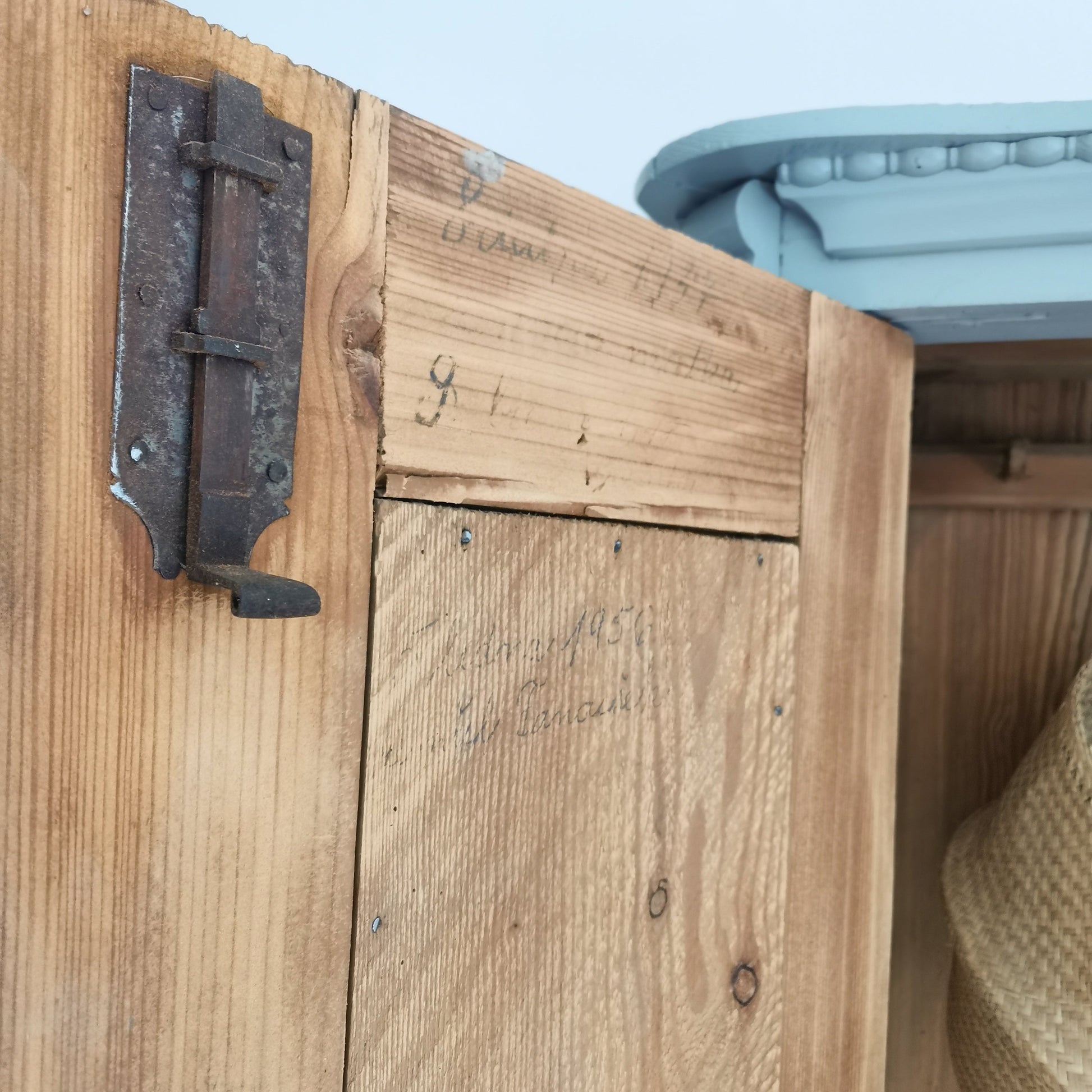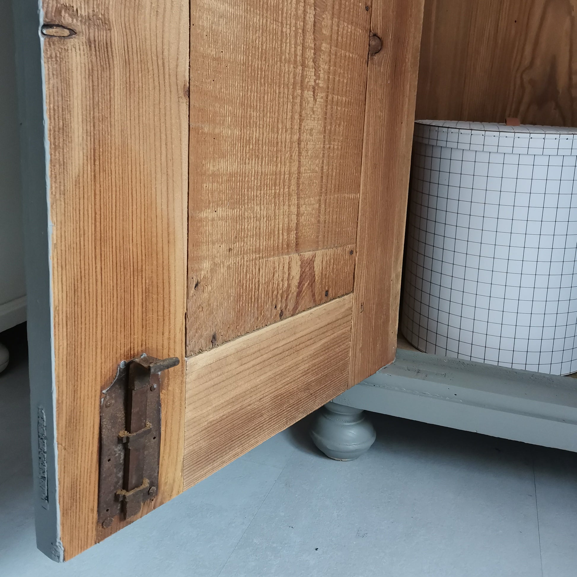 Dieser Schrank kommt aus Tschechien und wurde dort von einem Restaurator bearbeitet. Er hat einen schönen Patina Charme. Die alten originalen Riegel wurden erhalten und an der linken Tür haben sich ein paar Vorbesitzer verewigt :-) Der erste Eintrag ist von 1934. Wir lieben es.