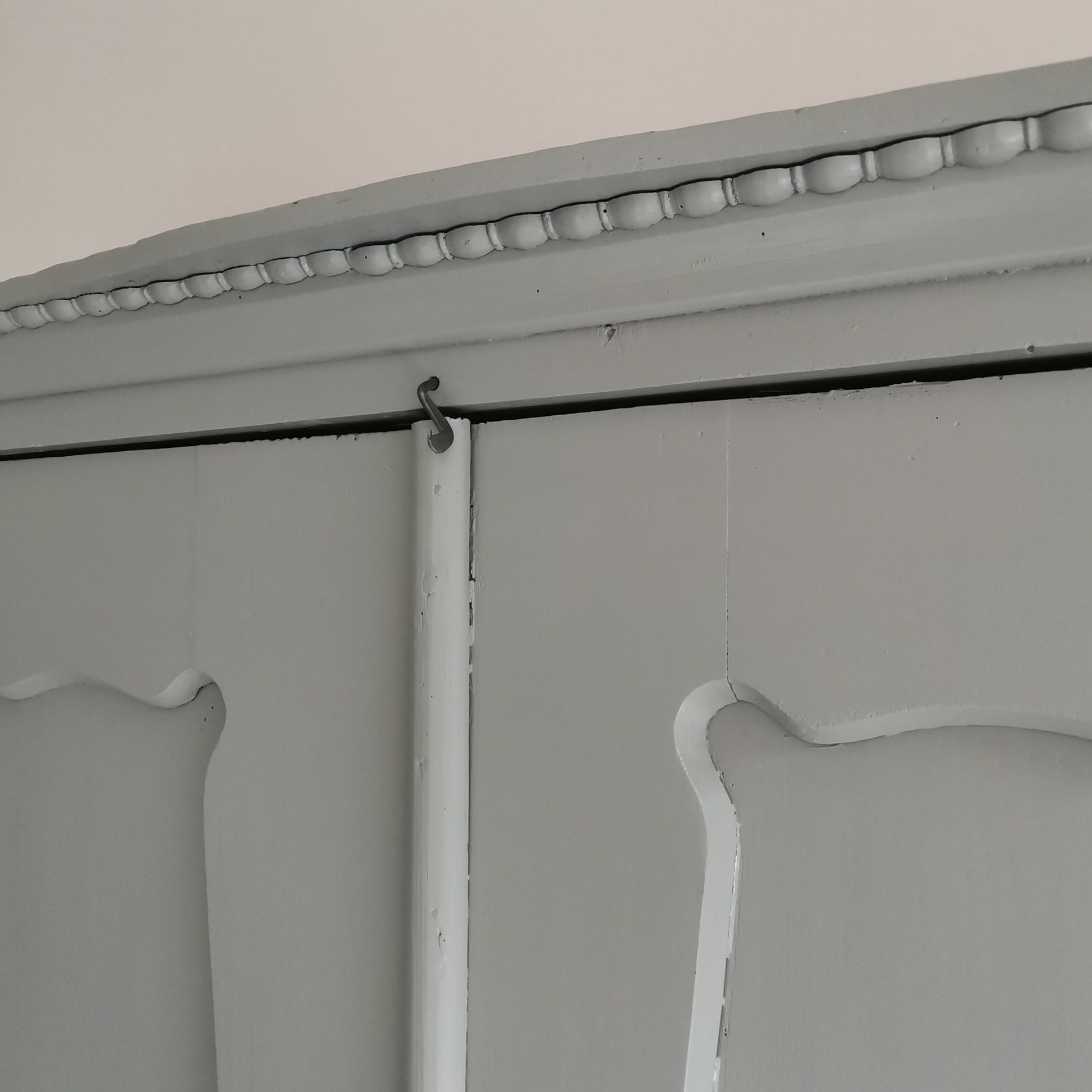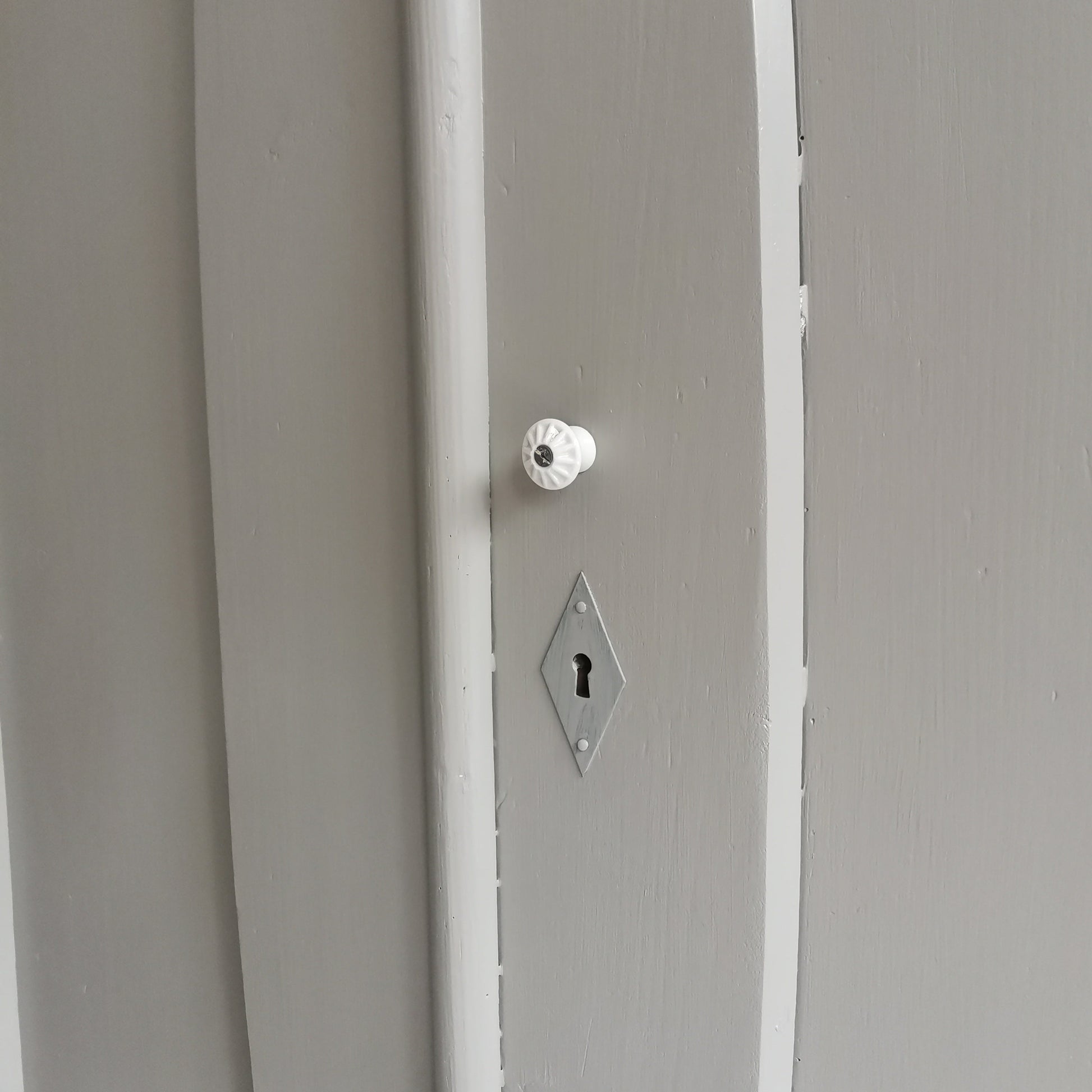 Das alte Schloss hat keine Funktion mehr, sodass der Schrank mittels kleinem Riegel verschlossen wird. Im Inneren befindet sich eine Hakenleiste.
