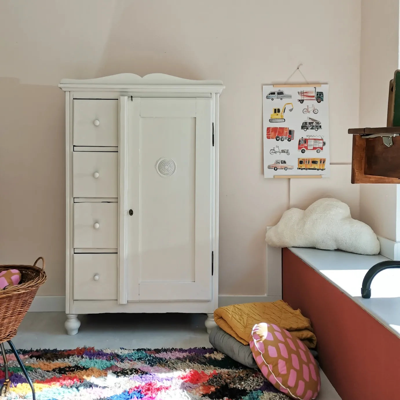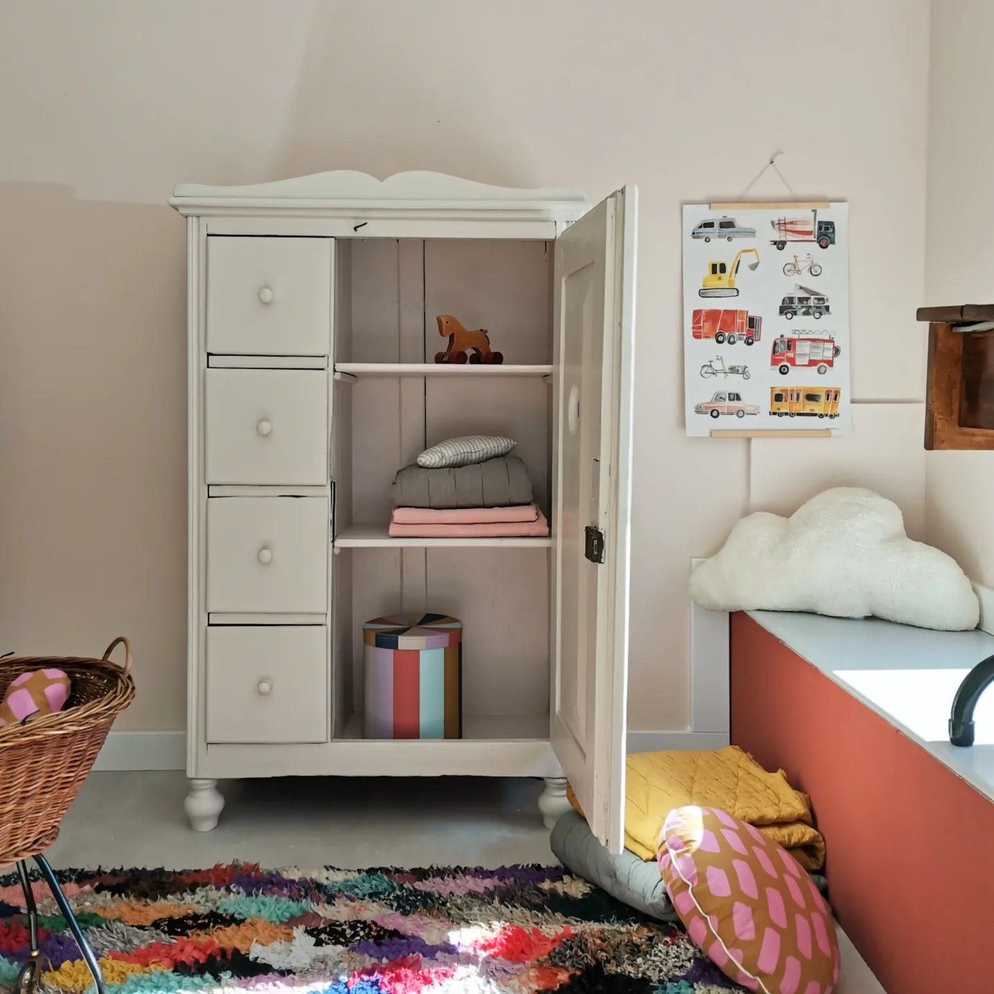 Vier tiefe Schubladen bieten Stauraum für so Allerlei und im Schrankteil lassen sich Geschirr, Wäsche oder Spielzeug gut verstauen.