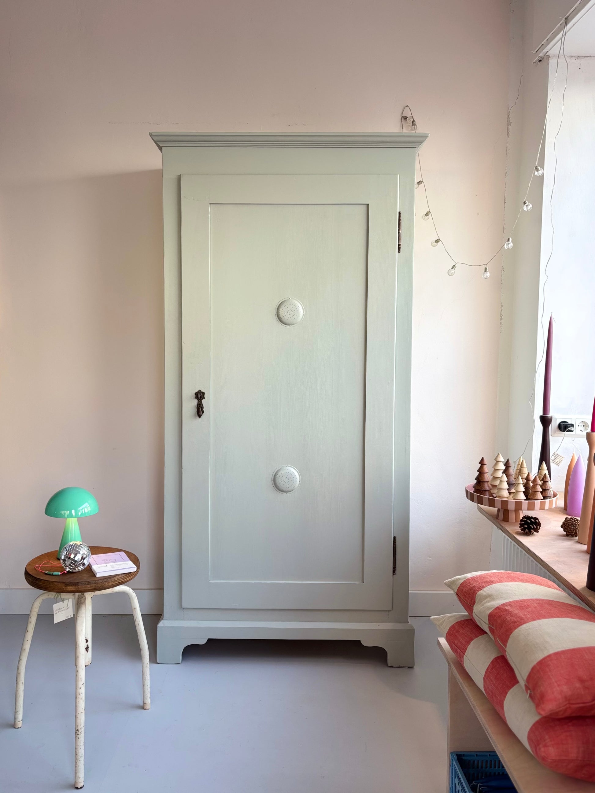 Er wurde im Tauchbad von alten Schichten befreit und anschließend ausgebessert und Instand gesetzt. Zum Abschluss hat er ein sehr schönes hellblaugrau von Farrow & Ball verliehen bekommen.