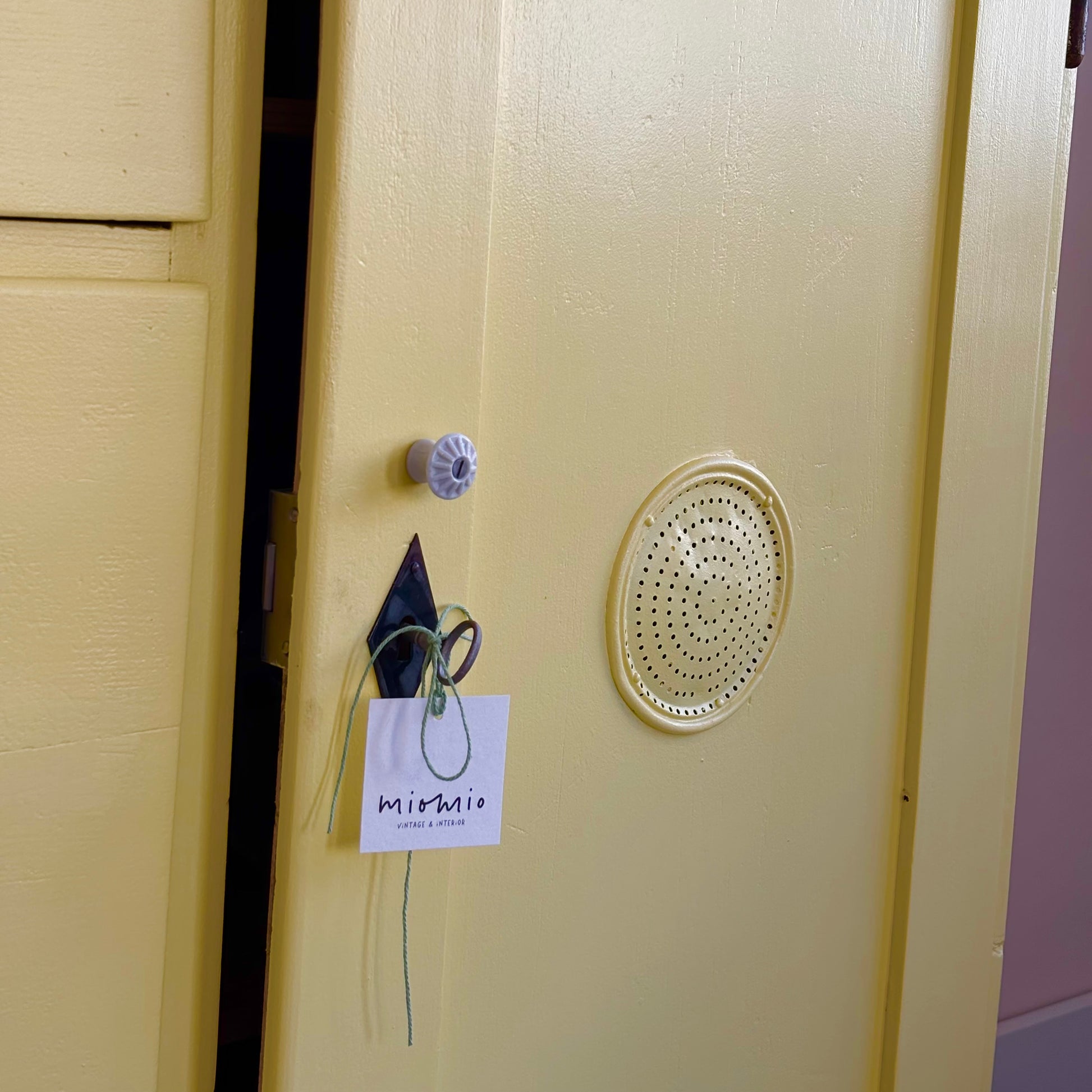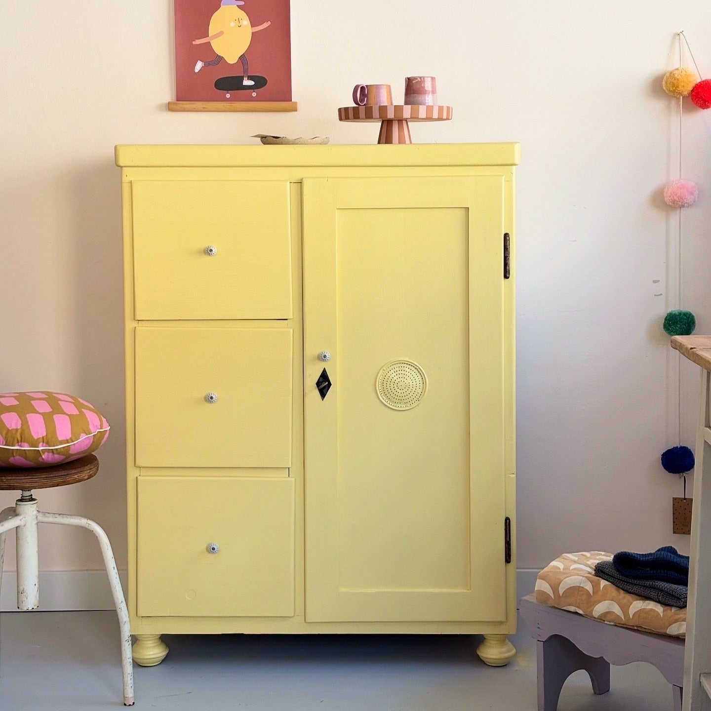 Der Brotschrank wurde geschliffen, Grundiert, 3x mit Lack von Farrow and Ball lackiert. Zudem hat er neue Füße und neue Porzellanknöpfe bekommen.