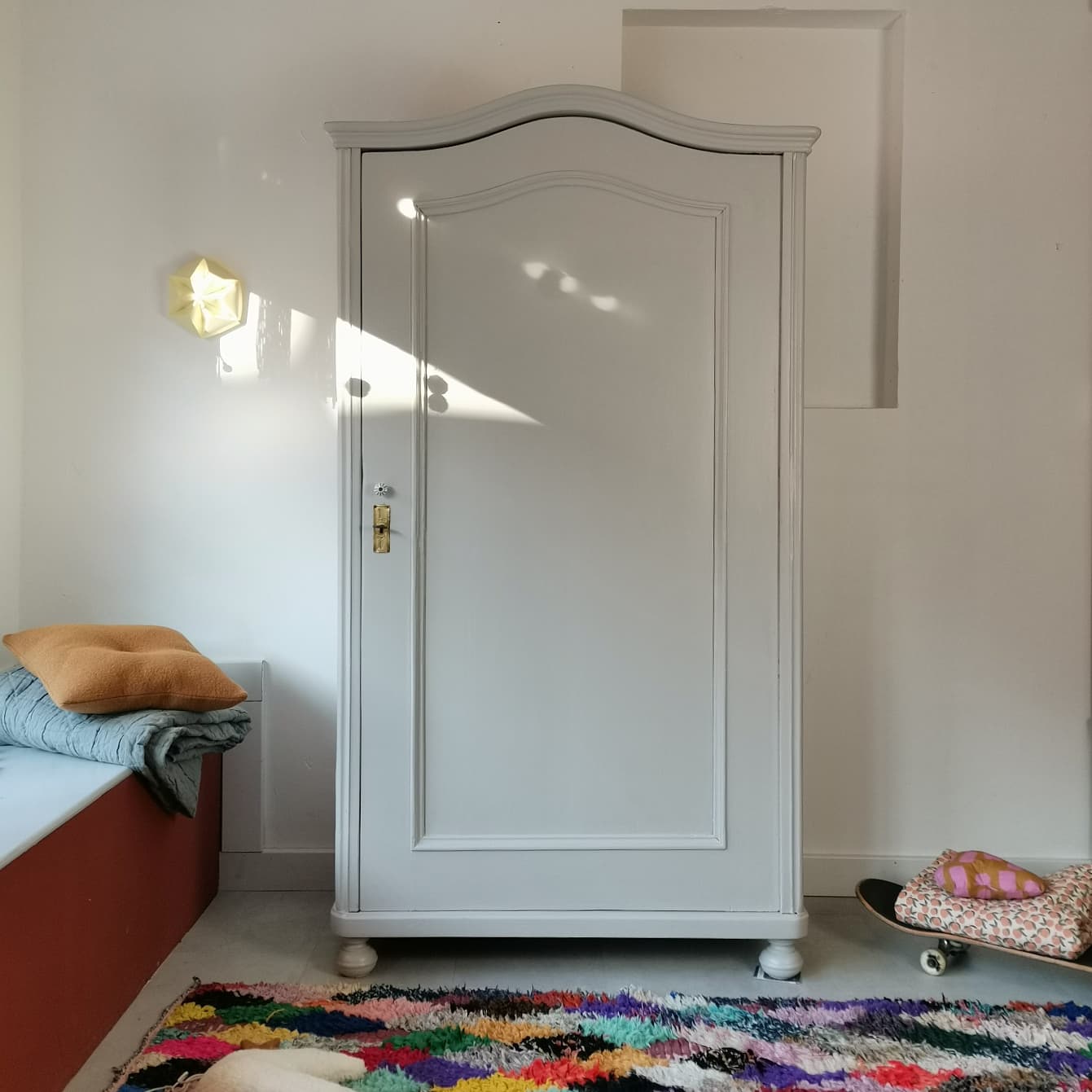 Dieses schmucke Schätzchen in hellem grau ist neu am Sonnenplatz. Mit einem knappen Meter Breite findet dieser antike Schrank in vielen Zimmern ein Plätzchen. Und das Innenleben ist perfekt...
