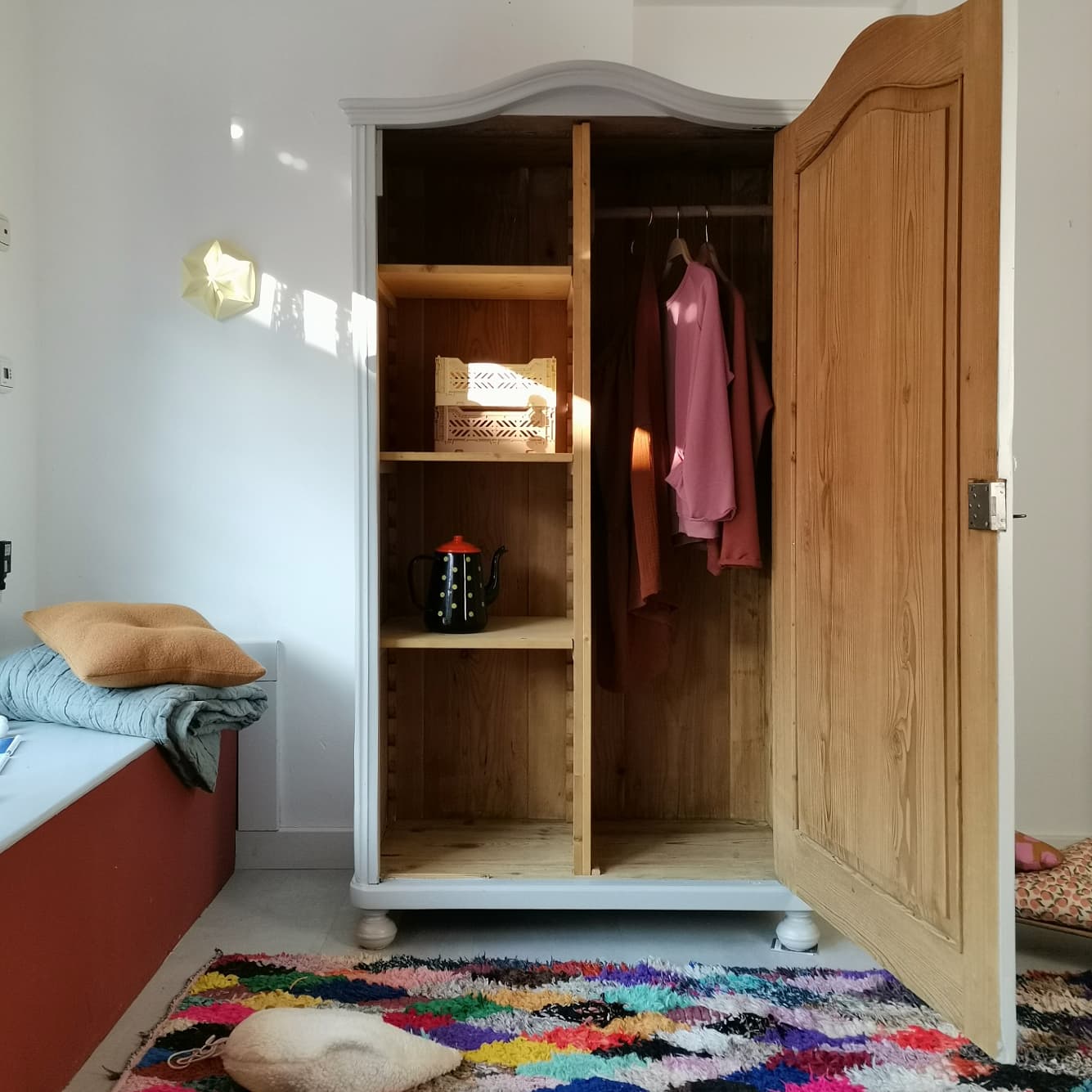 Unterteilt in Fächer auf der linken Seite und Kleiderstange auf der rechten findet hier viel Kleidung auf kleinstem Raum Platz :-)