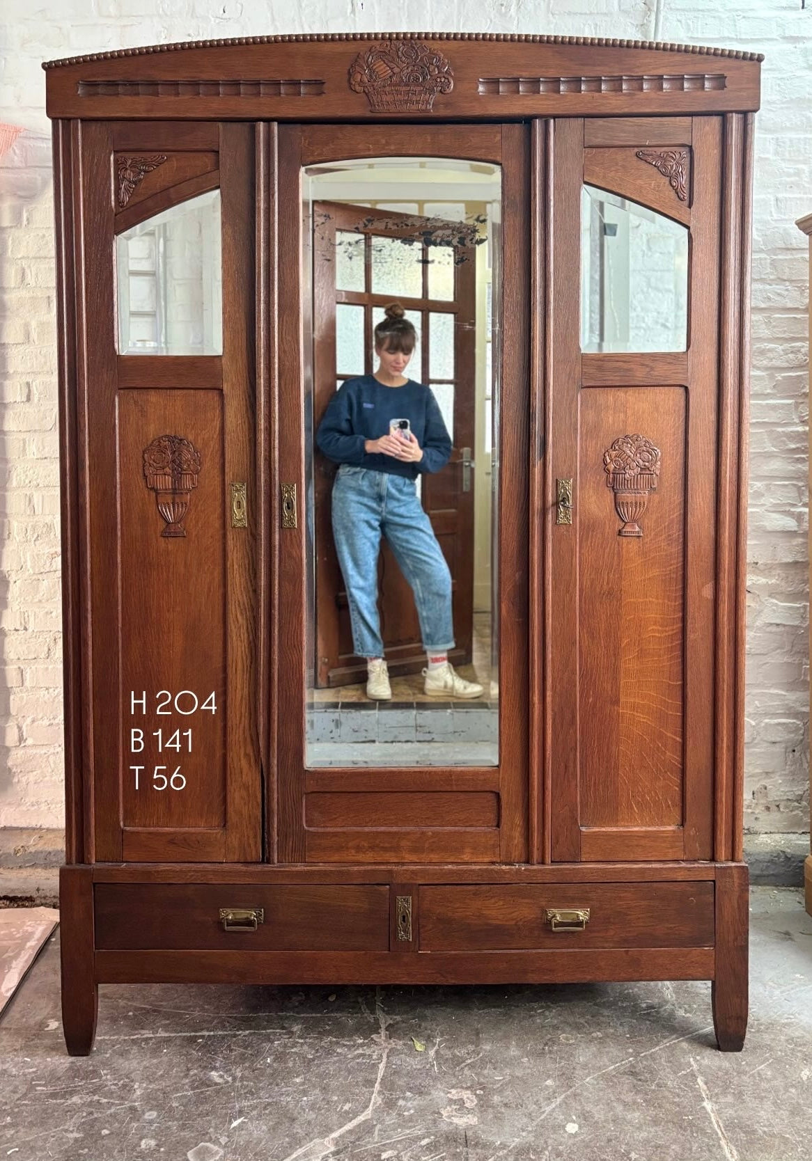 ausgestattet wird der Schrank mit 2-4 Regalböden und einer Kleiderstange. Er wird geschliffen, ausgebessert und in Wunschfarbe von Farrow&Ball lackiert. Er verfügt über einen Schlüssel. Der mittlere große Spiegel wird erneuert.
