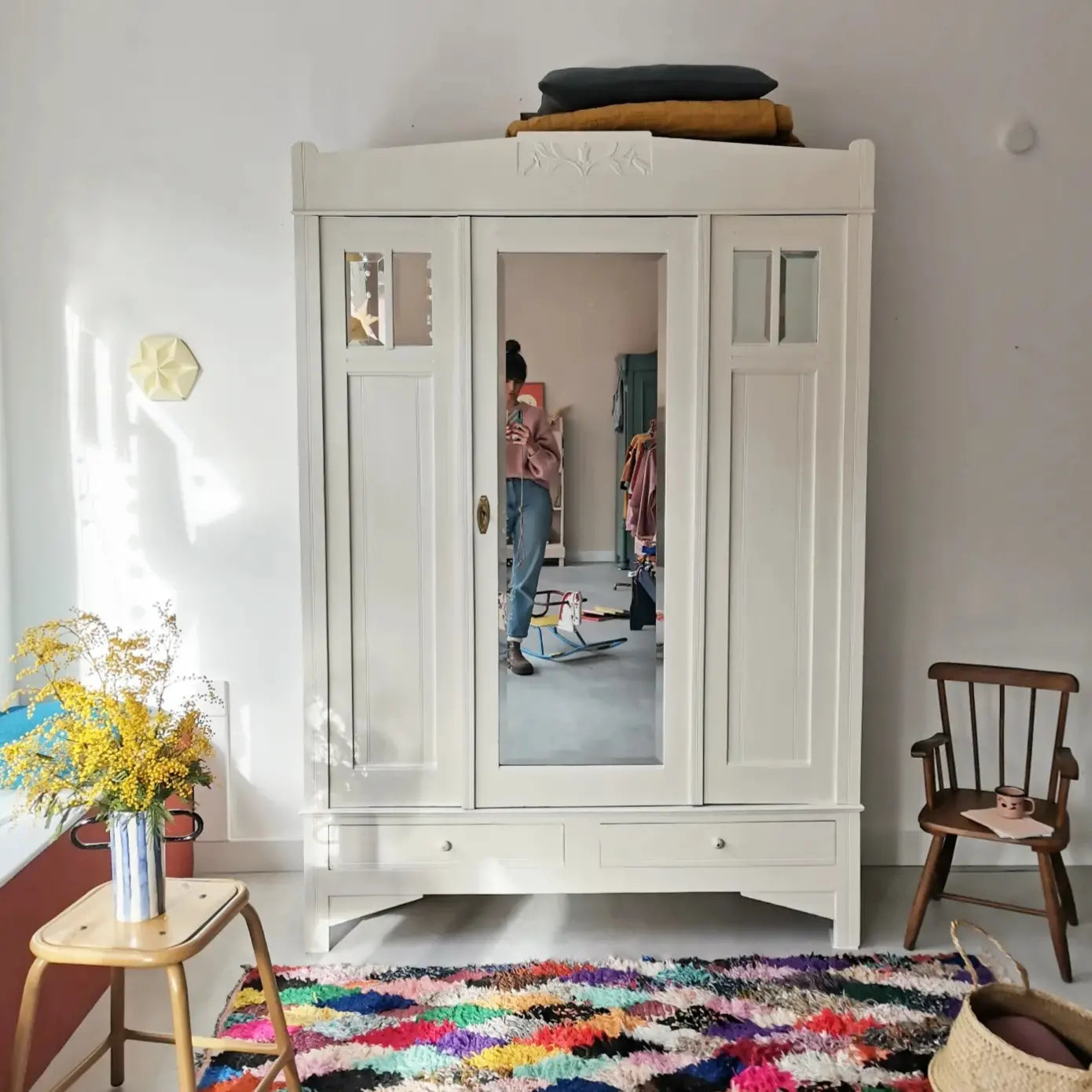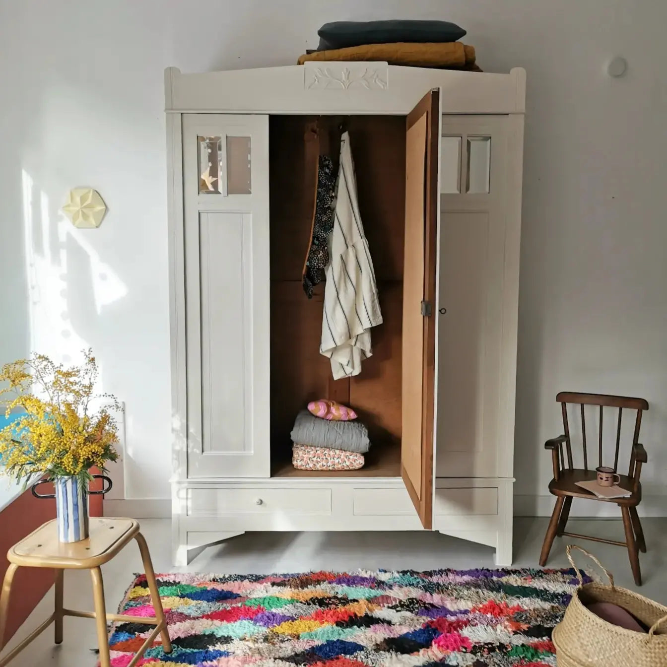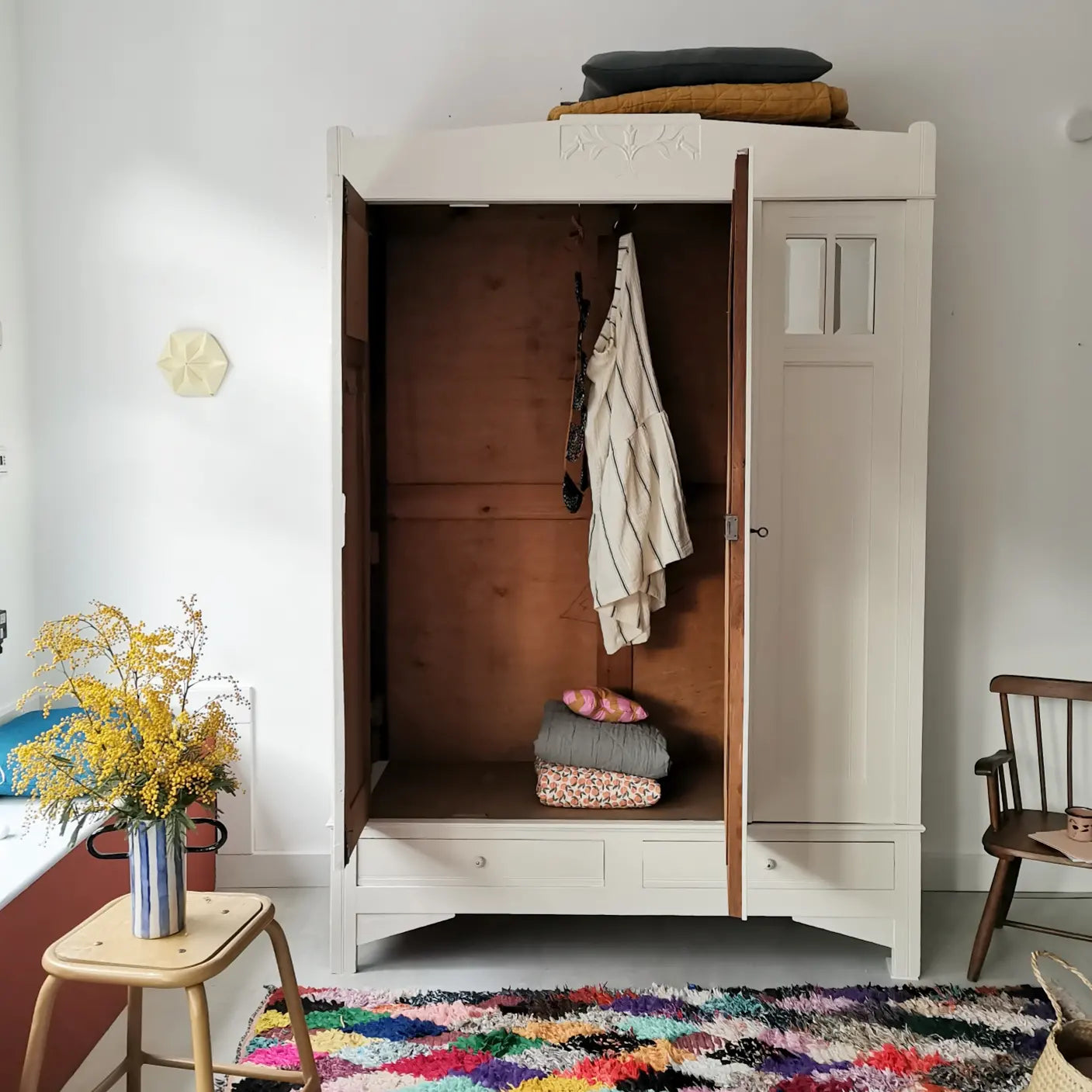 Der Schrank wurde mit Lack von little greene aufgearbeitet. Er verfügt im Inneren über eine Kleiderstange aus Metall und hat im unteren Bereich zwei Schubladen.