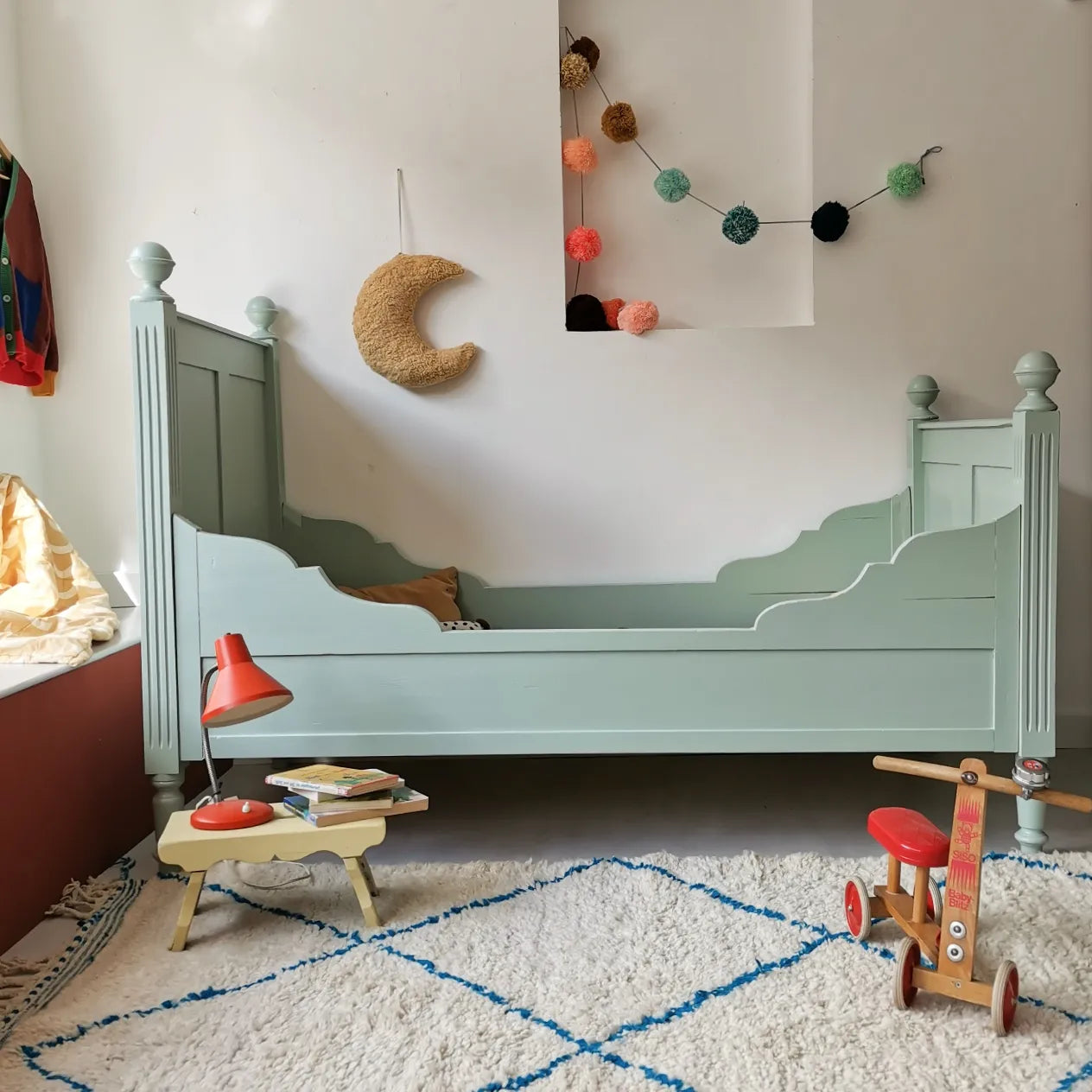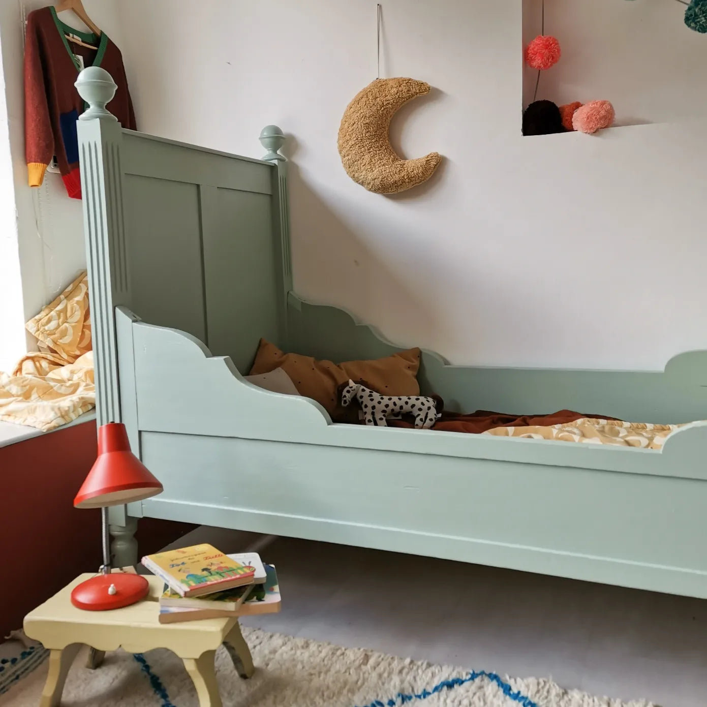 Wir haben das Bett geschliffen, fehlende Teile ersetzt und den Lattenrost an das Sondermaß angepasst. Anschließend wurde das Bett geschliffen, grundiert und es mit Lack von Farrow and Ball gestrichen. Et viola. Nun ist bereit in ein neues Zuhause zu ziehen.