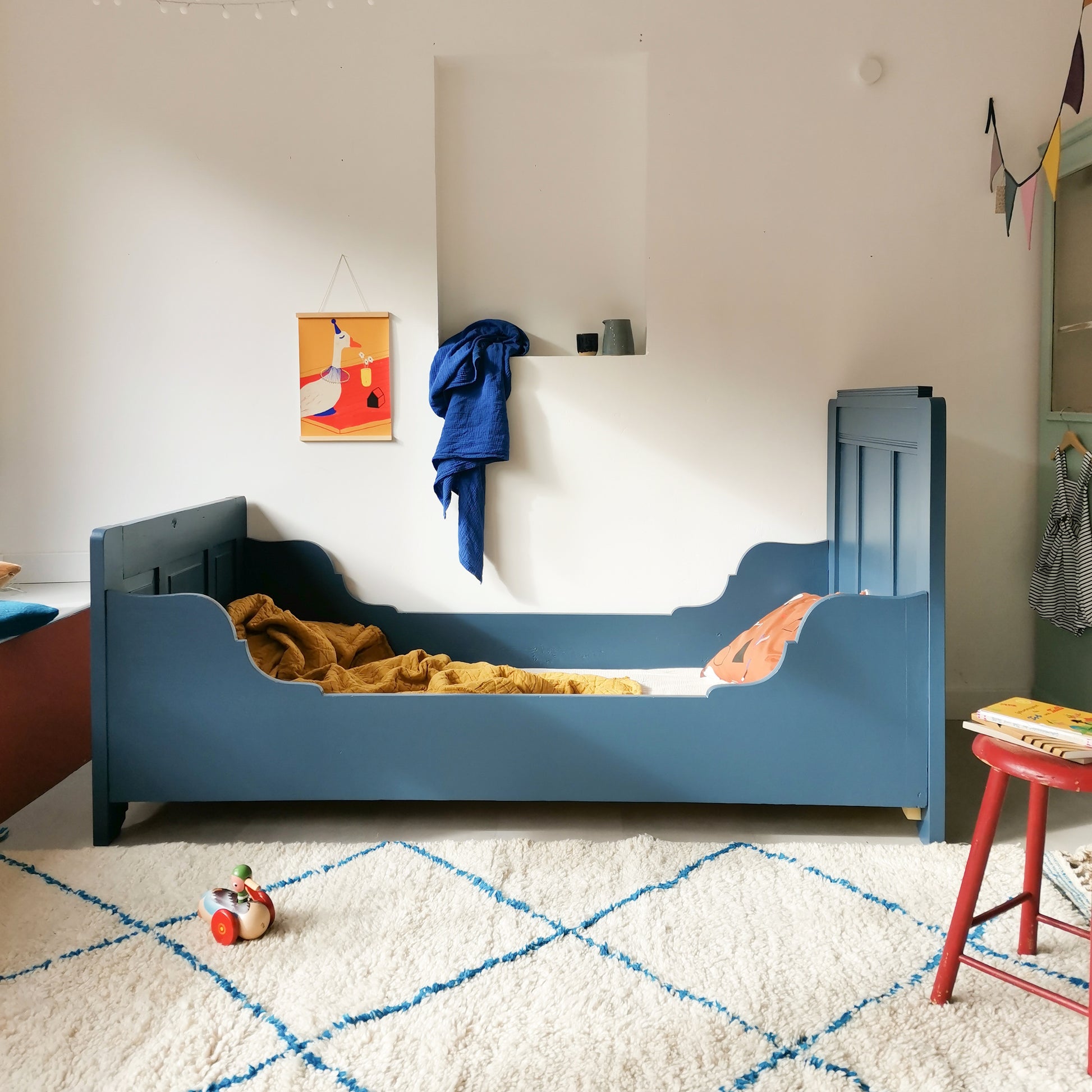 Das Bett wurde in einem tollen Blau aufbereitet. Es wird einfach zusammengesteckt und verfügt über einen individuell angefertigten Lattenrost.