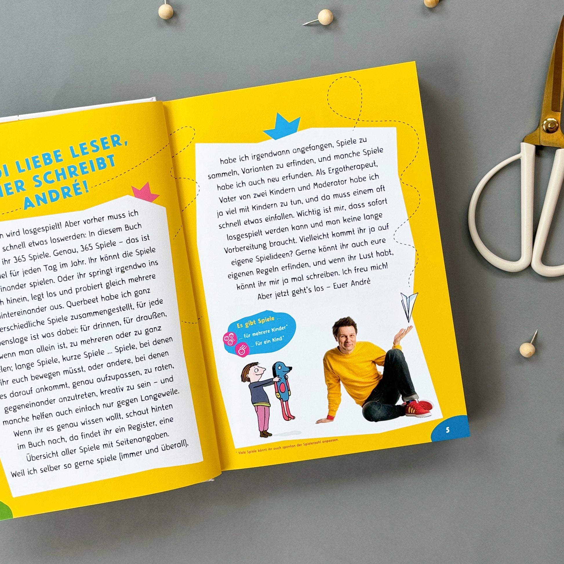 Der Moderator André Gatzke kennt sich aus mit Spielen und weiß, wie Kinder ticken. Als ausgebildeter Ergotherapeut, Vater und Moderator hat er viel Erfahrung, welche Spiele gut funktionieren und worauf es dabei ankommt: Es muss schnell zur Sache gehen, Spiele dürfen nicht kompliziert und in ganz unterschiedlichen Situationen umsetzbar sein. So hat er 365 Spiele gesammelt, Spielvarianten entwickelt und neue Spiele erfunden, mit denen Kinder ihre Geschicklichkeit, Beweglichkeit und Denkfähigkeit trainieren können. Einige sind auch einfach Quatsch, der Spaß macht.