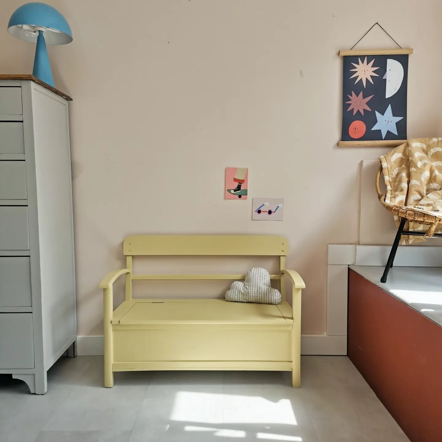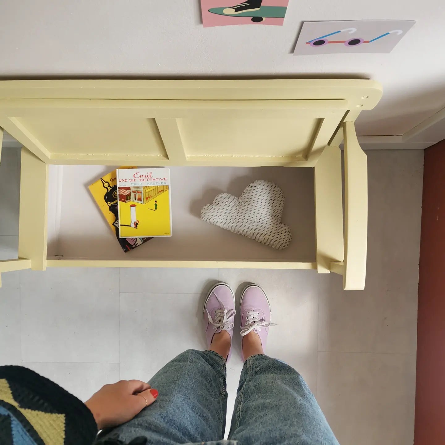 Die kleine midcentury Truhenbank hat Aussen mein Lieblingsgelb und Innen ein zartes Rosa bekommen. Jetzt strahlt sie hier so vor sich hin und erhellt den Raum und die Laune 🌼🥰