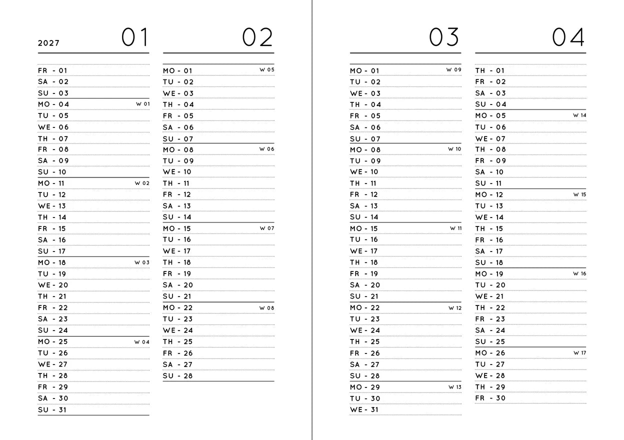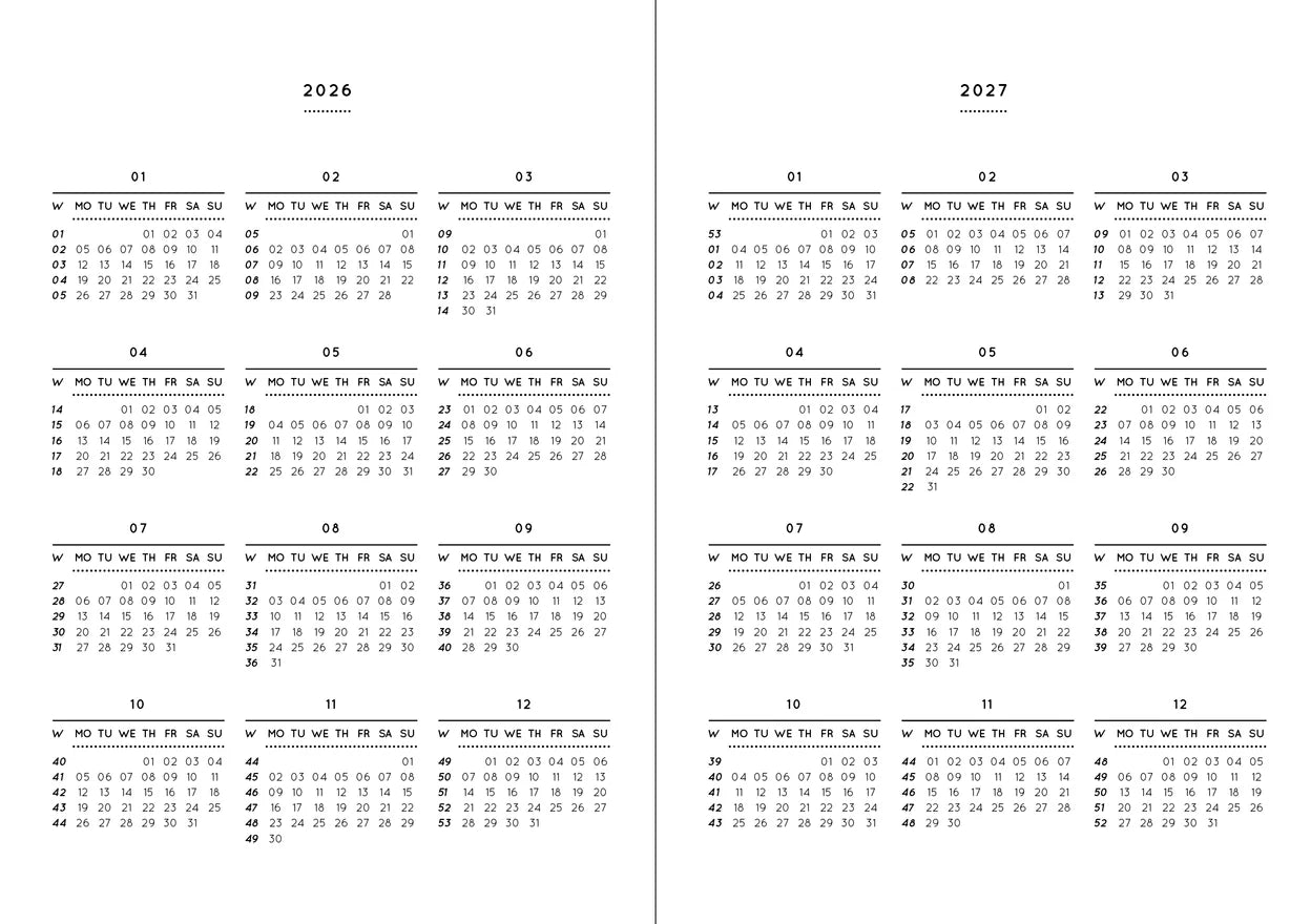 Inhalt: Jahresüberblick für 2026 und 2027, eine Übersichtsseite pro Monat, Wochenübersicht (Doppelseite) mit Platz für Notizen, monatliche Übersichtsseiten für 2027, eine Notizseite, Zwischenseiten mit positiven Impulsen.
