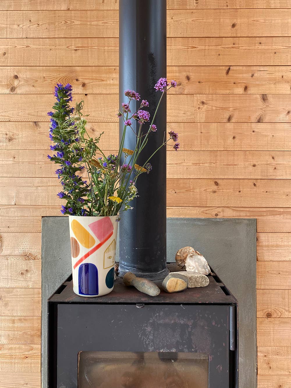 Handbemalt mit abstrakten Formen und freundlichen Gesichtern ist jede Vase ein Unikat.