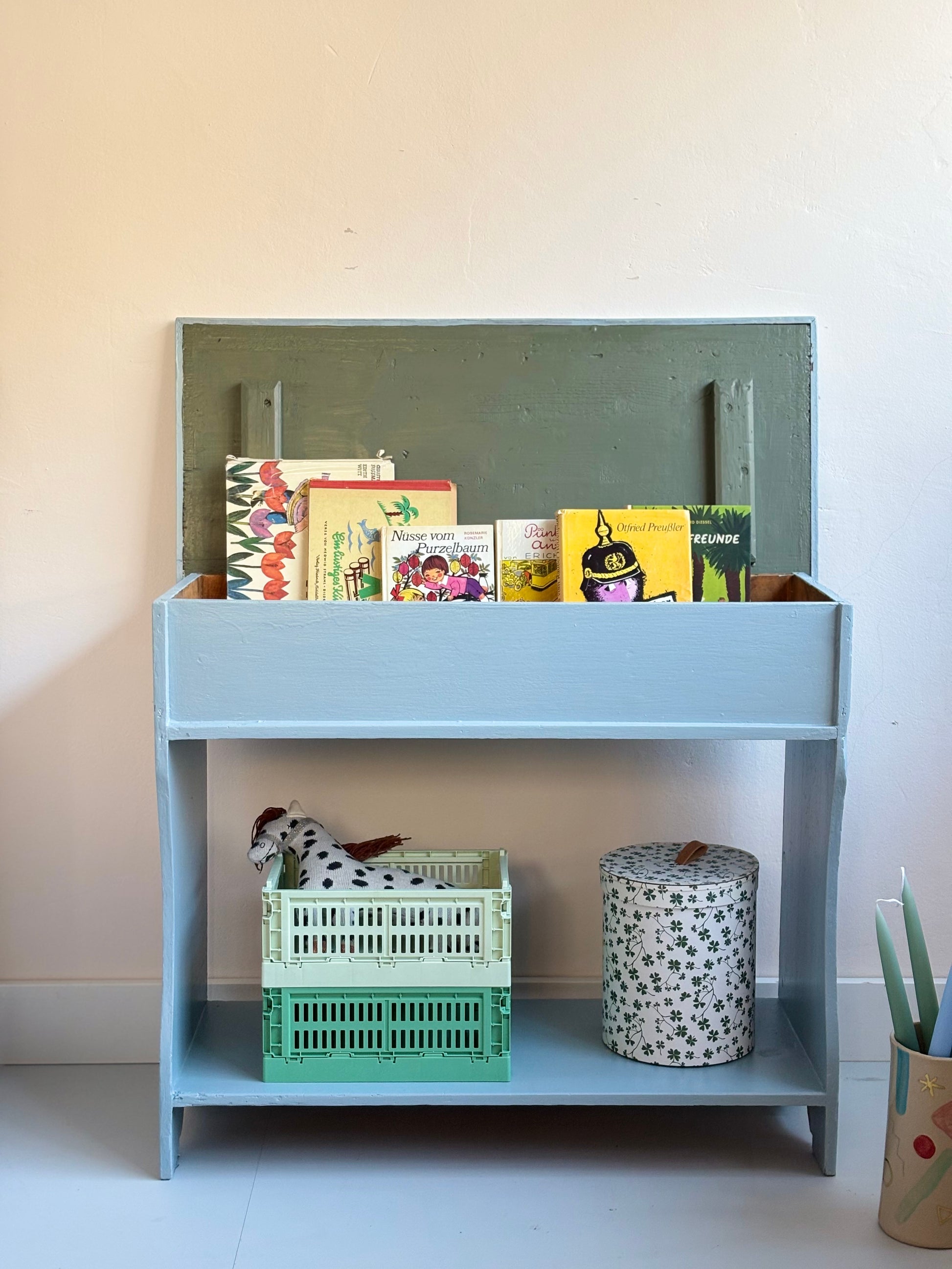 Die kleine Bank hat schon eine Jahre ‚auf den Buckel‘, das sieht man ihr auch an. Das macht sie so charmant. Wir haben die Bank gestrichen. Außen in einem Himmelblau, den Deckel innen in Olive und das Fach haben wir im Ursprungszustand gelassen.
