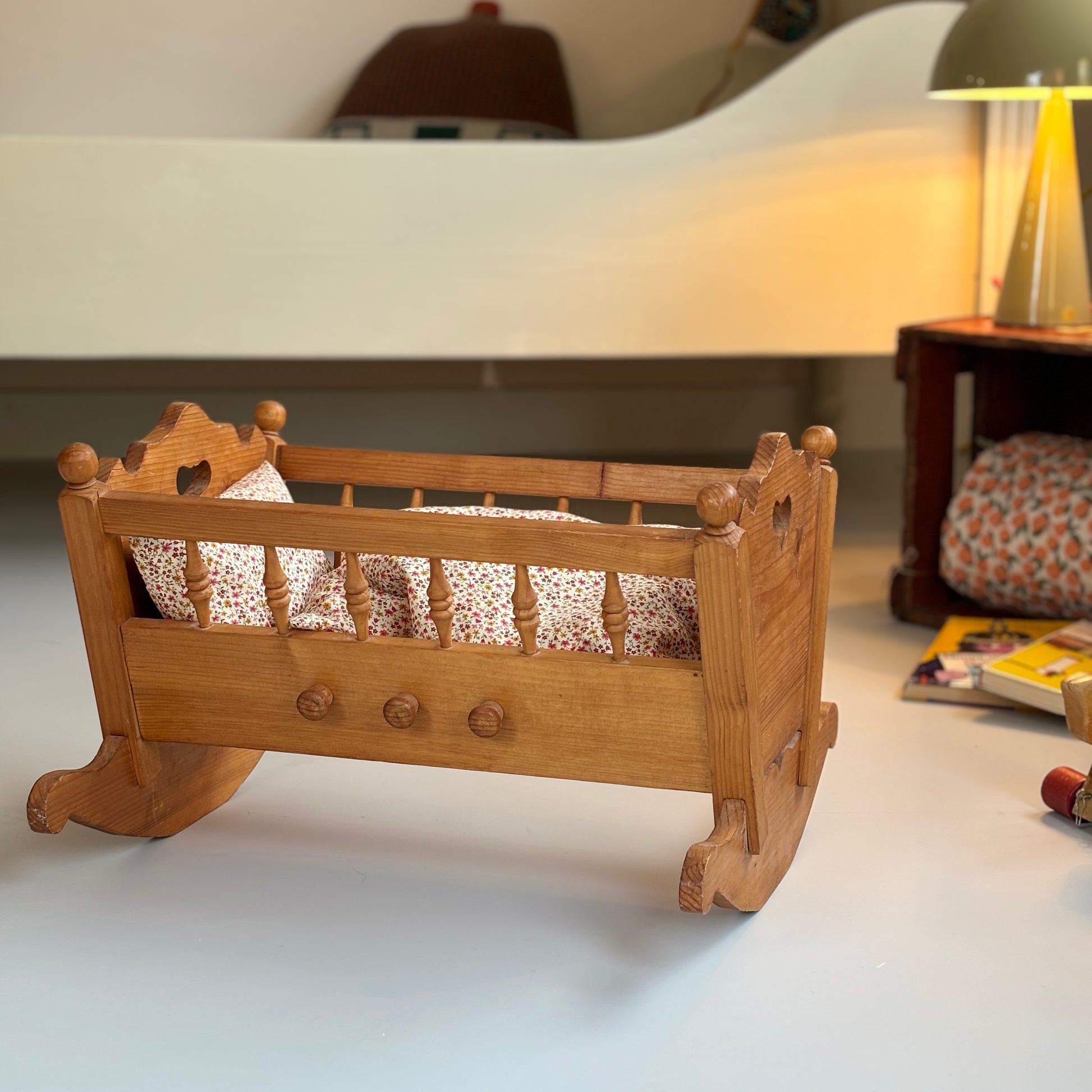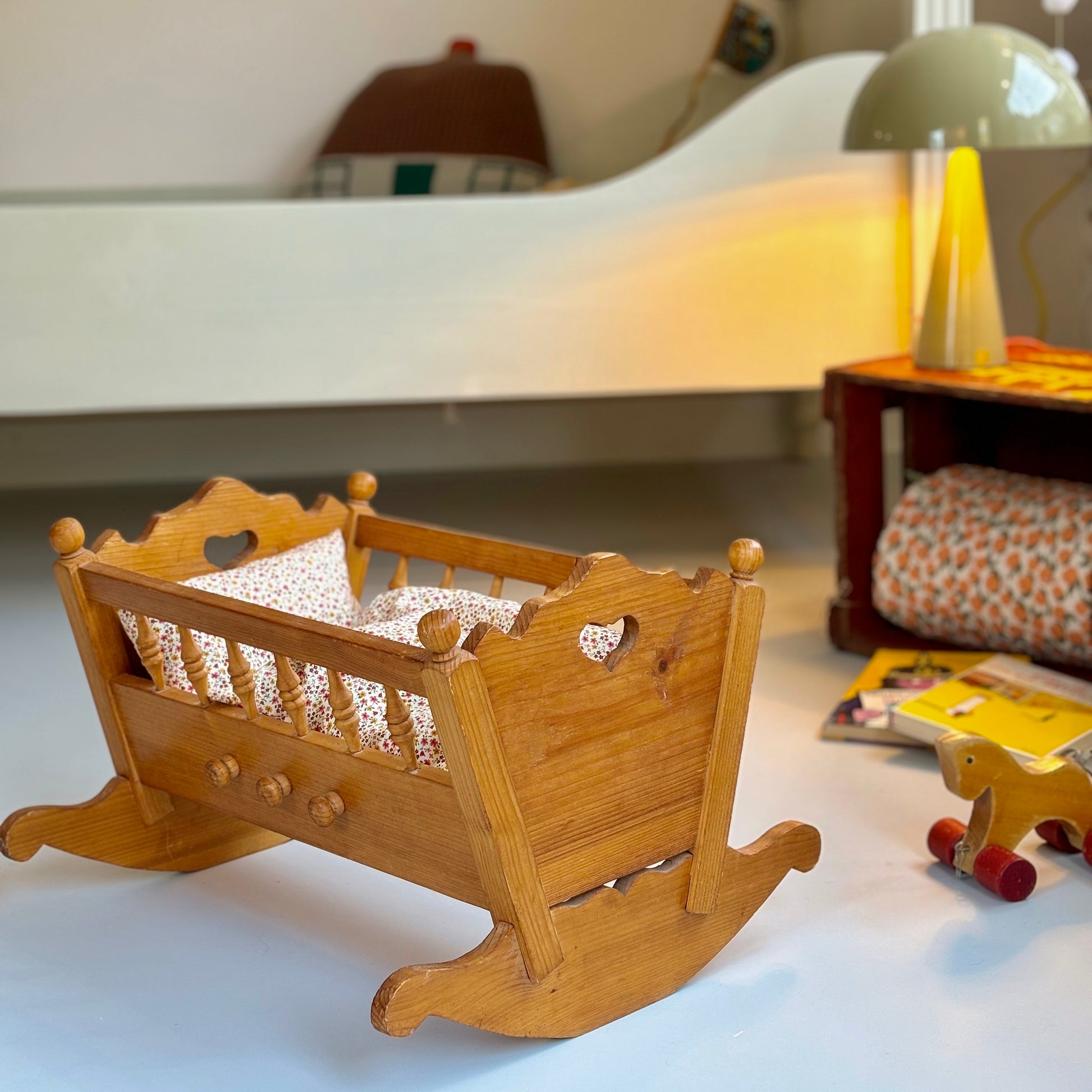 Eine hübsche kleine Puppenwiege aus Holz für Puppen, aber auch Teddys, Schweinchen oder andere Kuschelfreunde schlafen hier drin sicher wunderbar.