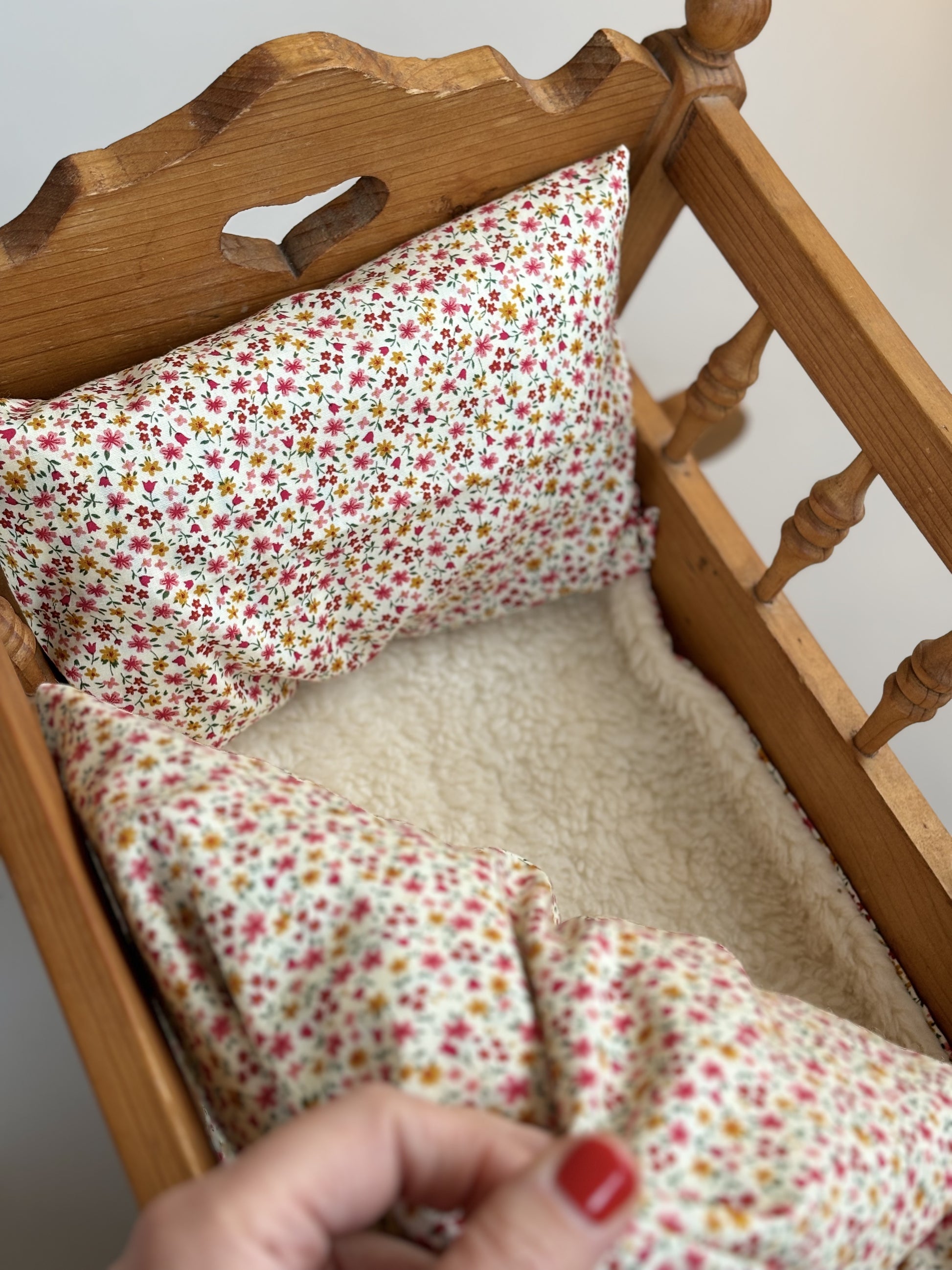 Die Bettwäsche wurde von uns extra für dieses kleine Bettchen genäht und passt mit dem schönen Blümchenmuster perfekt zum Vintagestück!