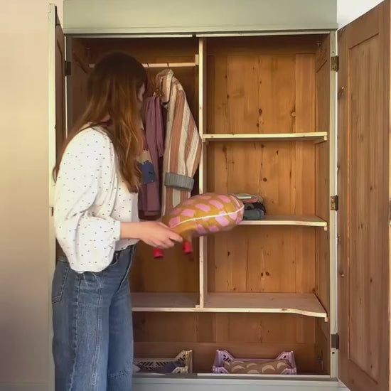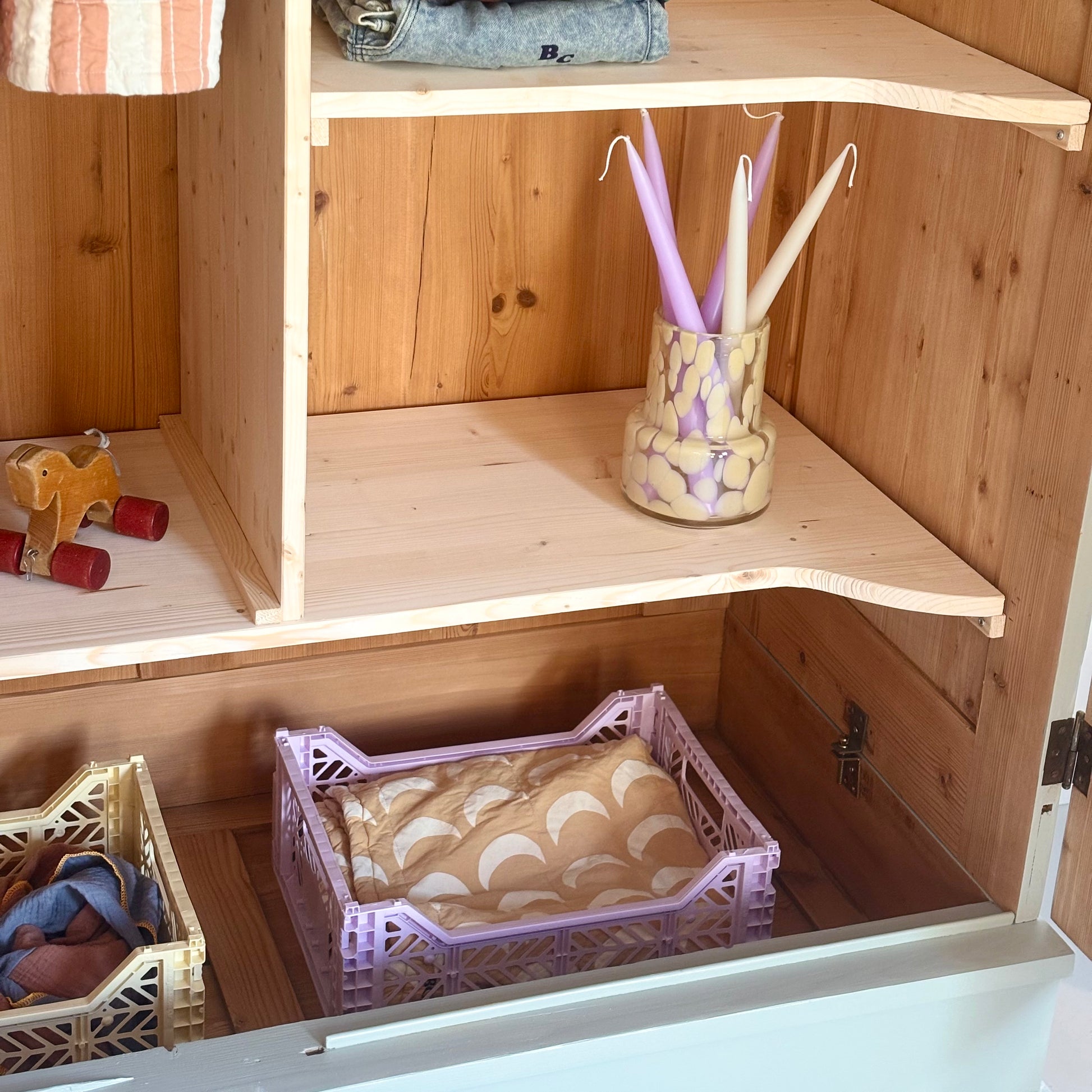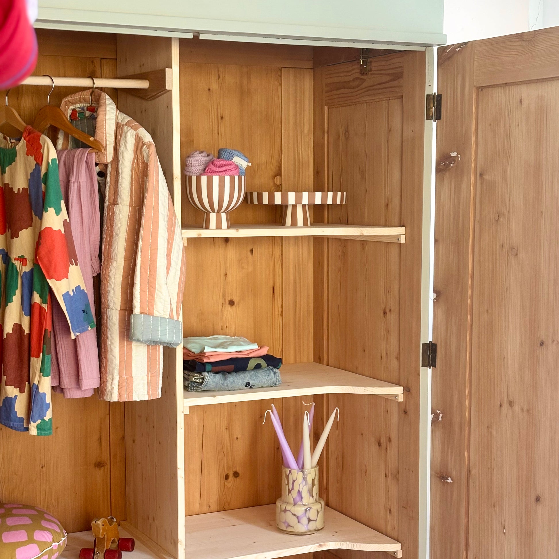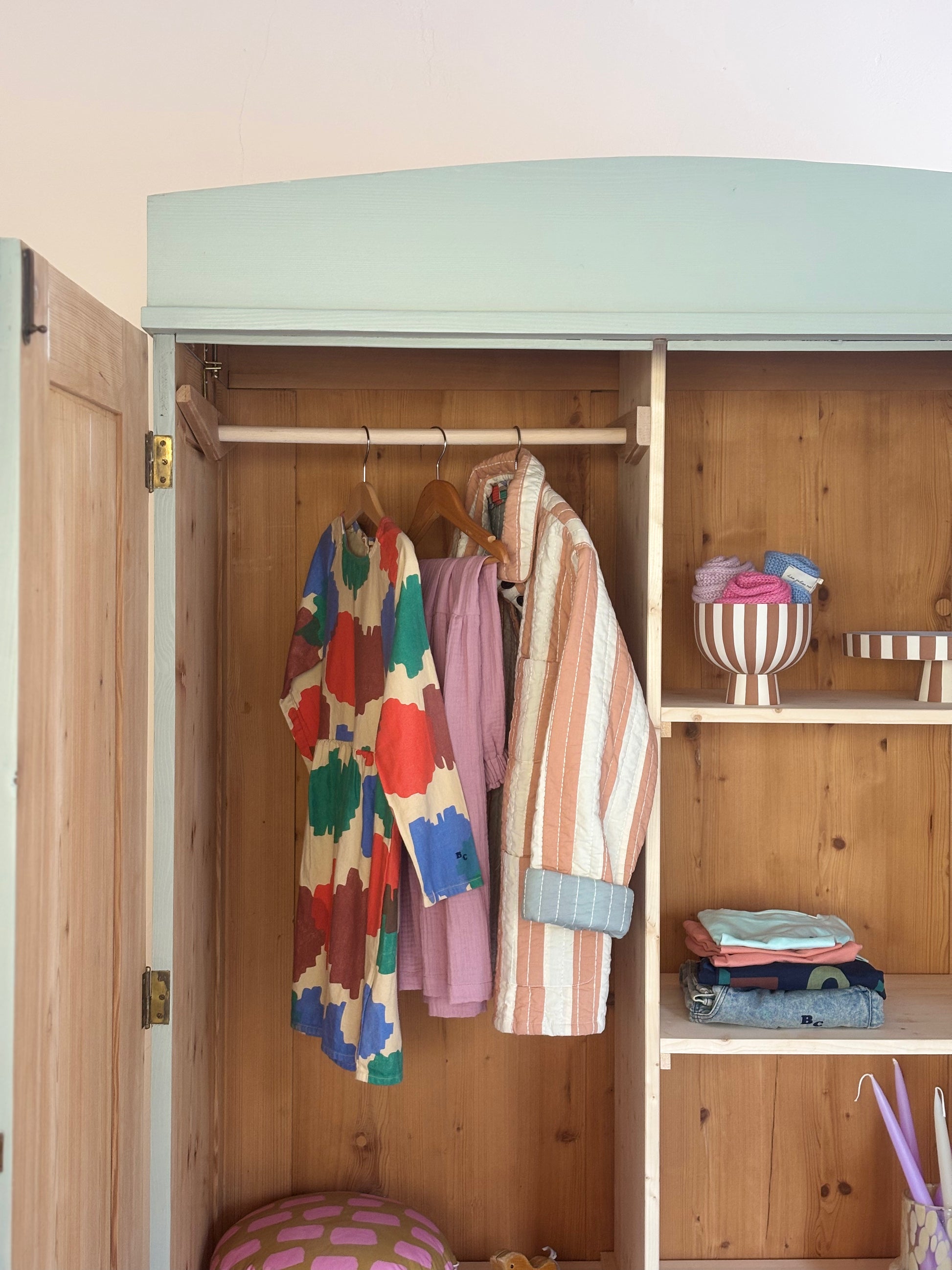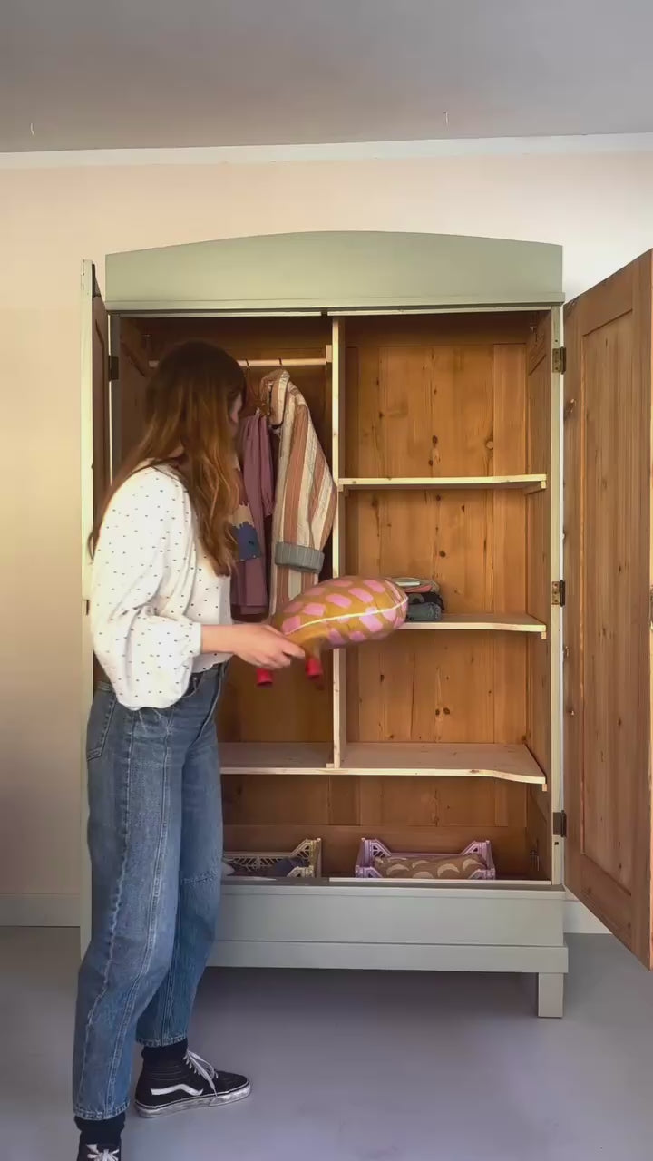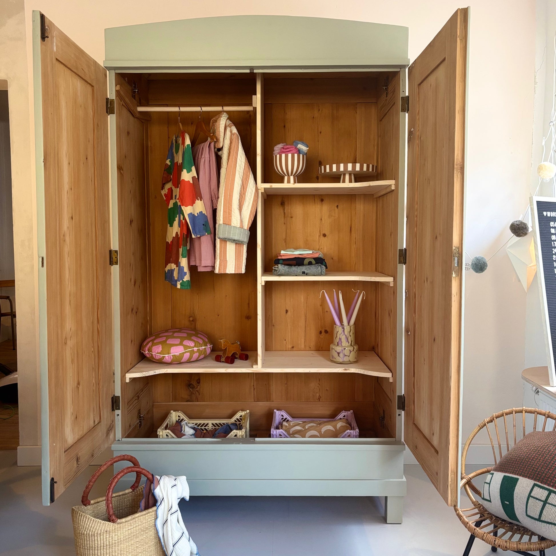 Wir haben den Schrank entwachst, geschliffen, grundiert und mit Lack von Farrow and Ball gestrichen. Die Verbindungen wurden erneuert und er hat einen individuellen Ausbau bekommen! Der untere Teil ist fast wie eine Truhe in der so einiges Platz findet.
