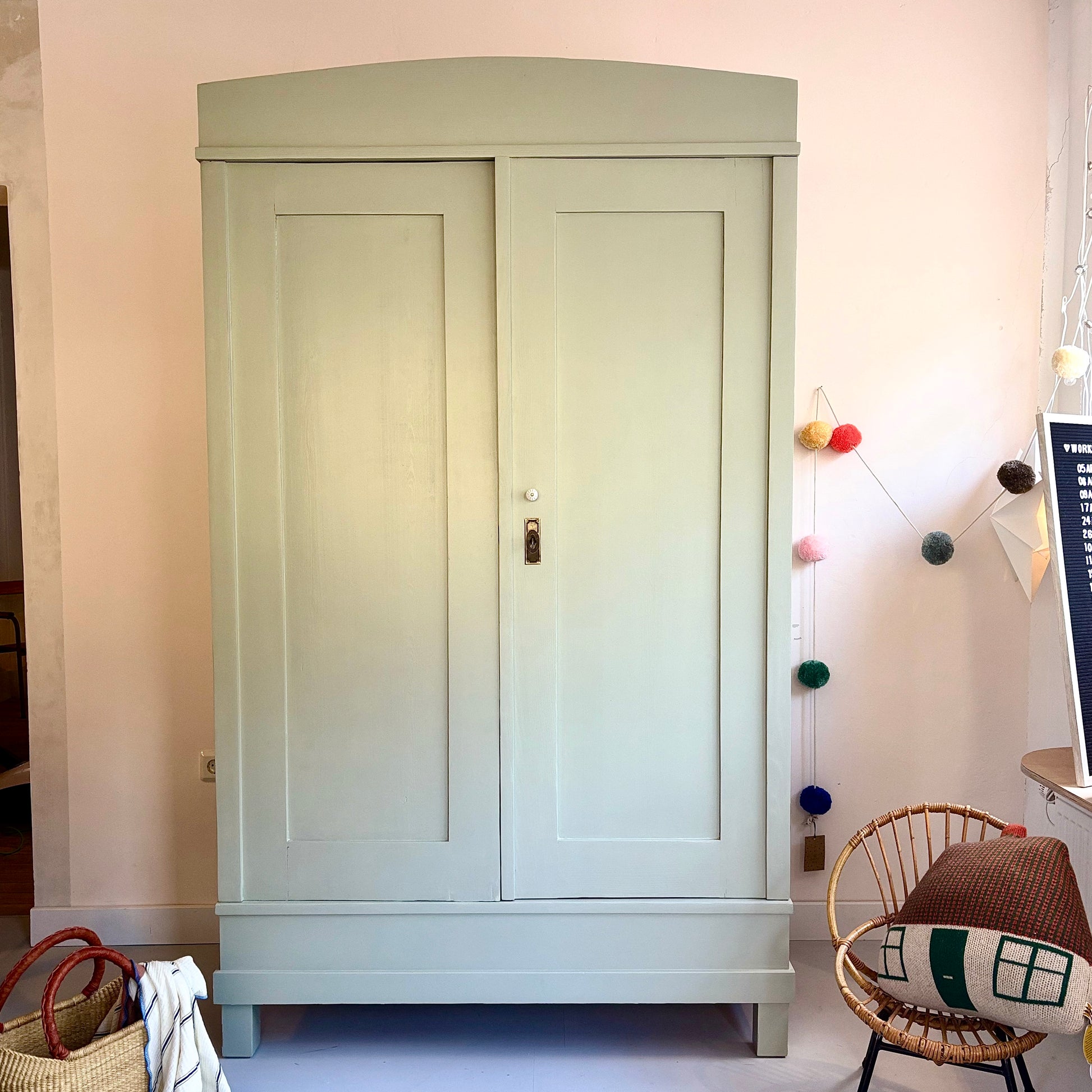 Ein toller schlichter Vintageschrank in hellem grüngrau! Er kann auseinander gebaut werden und ist somit leicht zu transportieren und passt auch durch enge Treppenhäuser!