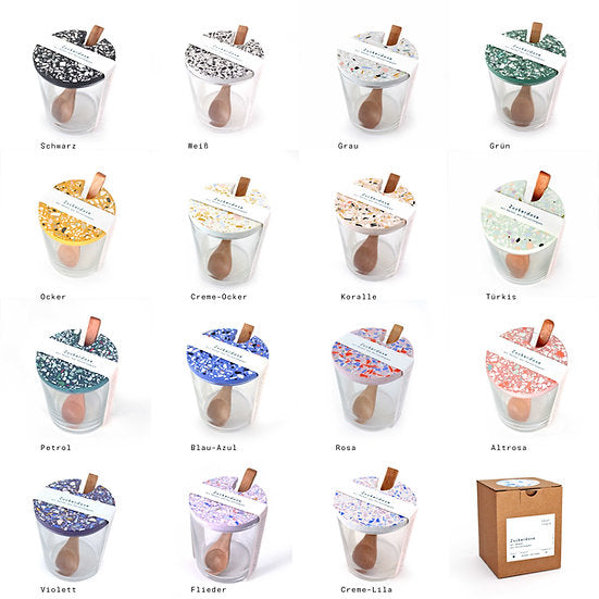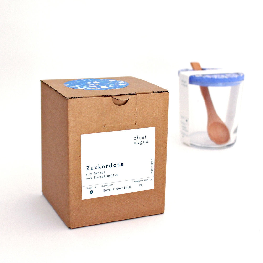 Dose mit Terrazzo Deckel aus Porzellangips.
